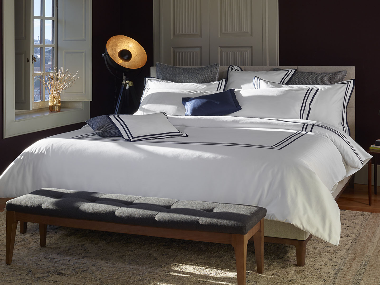 Model Amalia Sonata to niebywałe połączenie najlepszego gatunku bawełny egipskiej Giza 94 w gęstym splocie satynowym 430TC z pięknym subtelnym wzorem w postaci kolorowej potrójnej ramki
