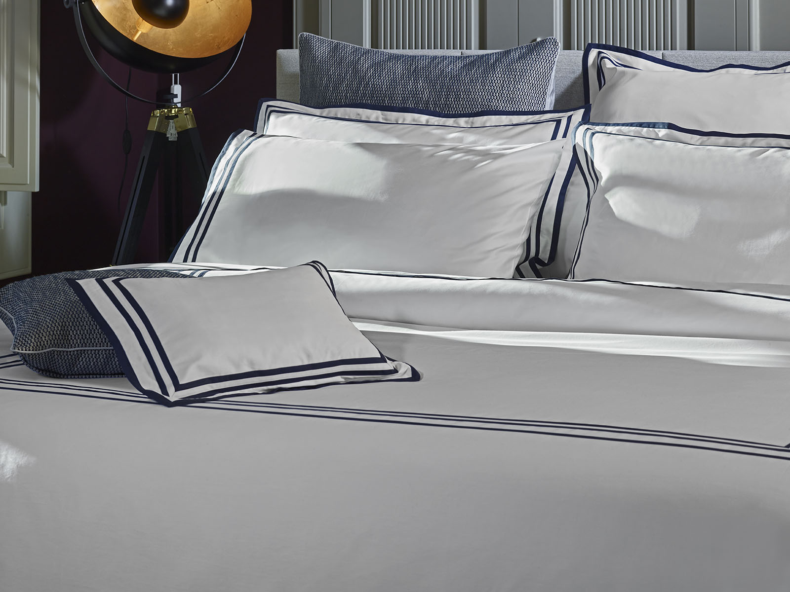Model Amalia Sonata to niebywałe połączenie najlepszego gatunku bawełny egipskiej Giza 94 w gęstym splocie satynowym 430TC z pięknym subtelnym wzorem w postaci kolorowej potrójnej ramki