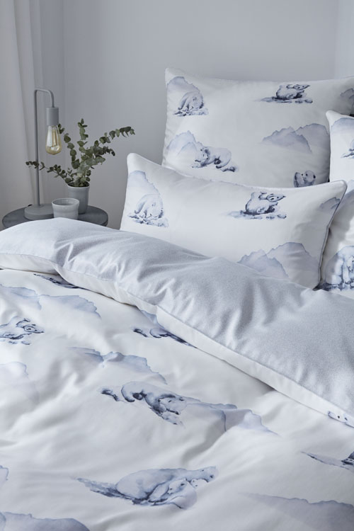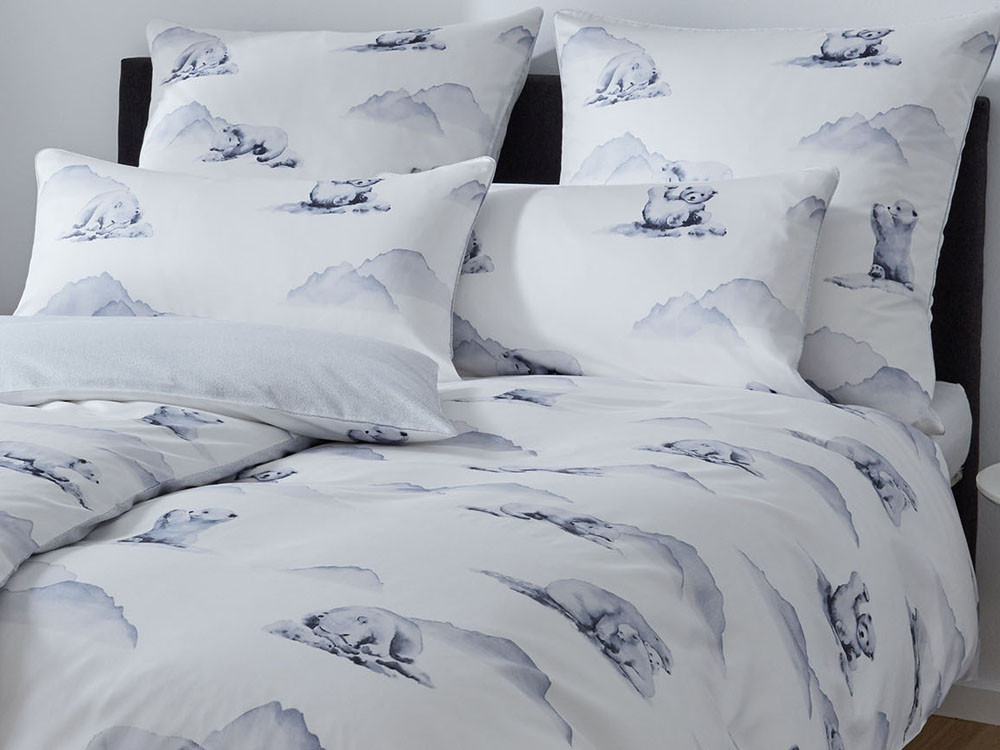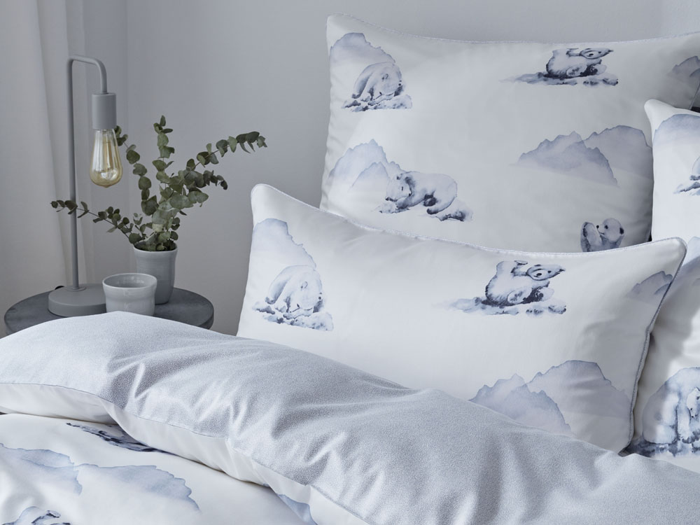 Pościel utrzymana jest w jasnoszarej tonacji