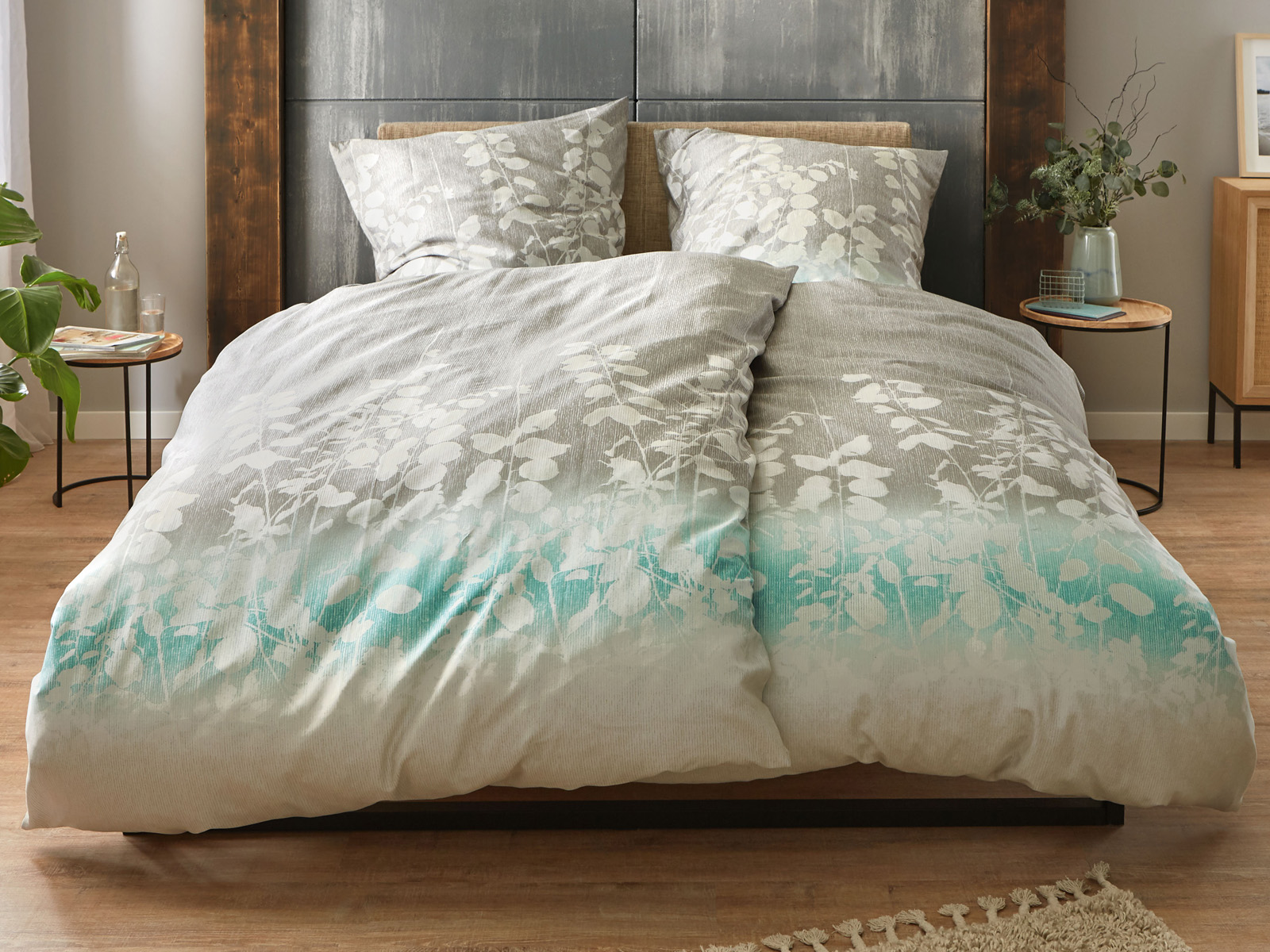 Pościel utrzymana jest w szarej tonacji