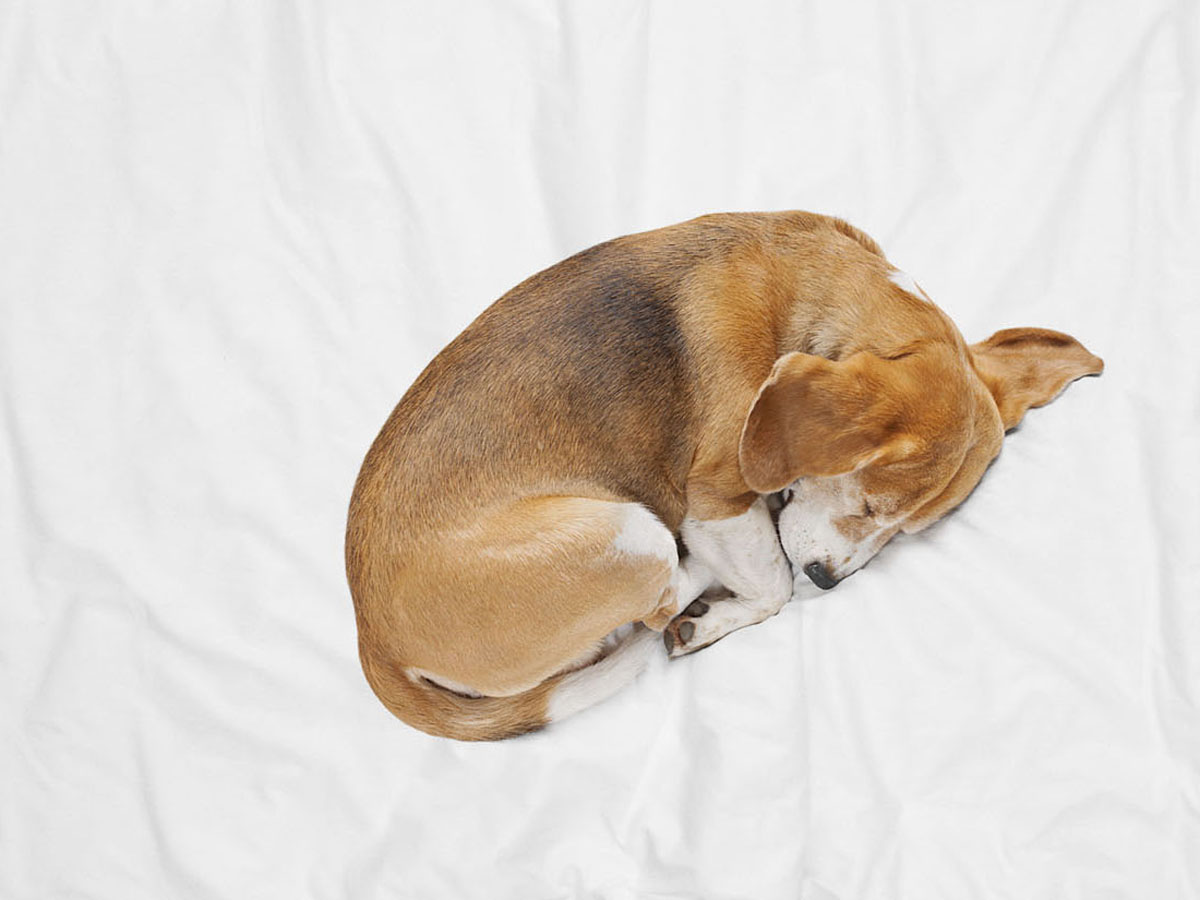 Pościel utrzymana jest w białej tonacji z brązowo-beżowym elementem w postaci śpiącego pieska