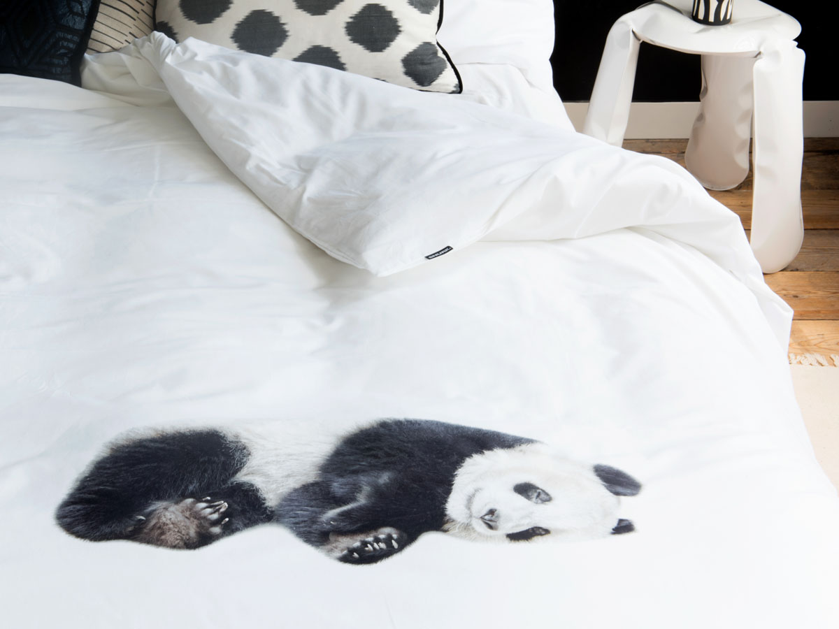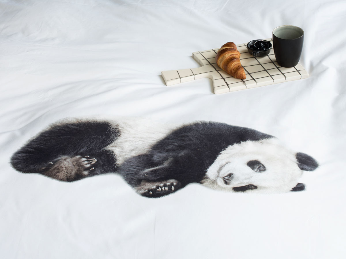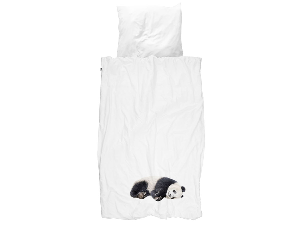 Pościel Snurk Panda prezentuje pandę leżącą w dole kołdry.