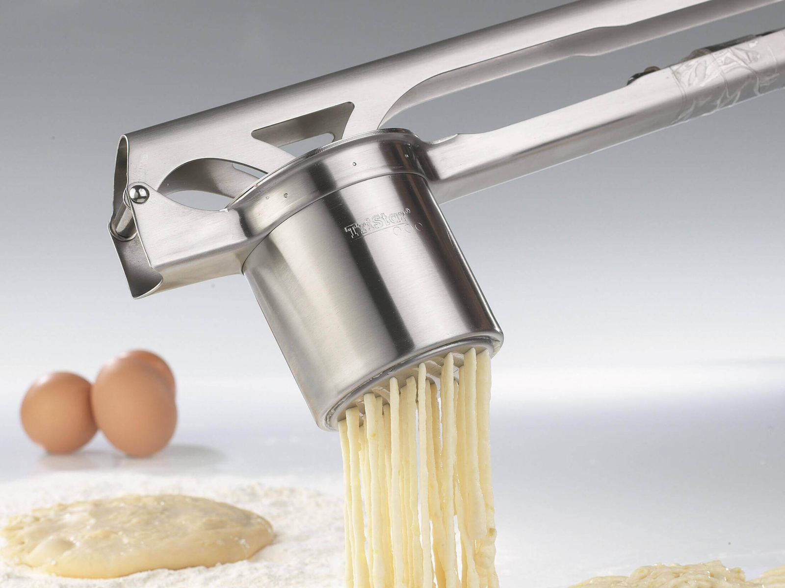 Praska do ziemniaków GEFU Tri Star to niezwykle pomocne urządzenie, które pozwala na przygotowywanie różnorodnych potraw dzięki trzem wymiennym tarczom. Każda z tarcz ma inne perforacje – pierwsza z otworami 3 mm nadaje się do długich klusek, druga z otworami 2,5 mm pasuje do ziemniaków, warzyw i owoców, a trzecia ze specjalną perforacją została zaprojektowana do ręcznie robionych mącznych potraw. Solidna konstrukcja ze stali nierdzewnej gwarantuje trwałość, a możliwość mycia w zmywarce – łatwość utrzymania czystości. Uniwersalność praski sprawia, że idealnie sprawdzi się także przy przygotowywaniu domowych lodów czy spaghetti.