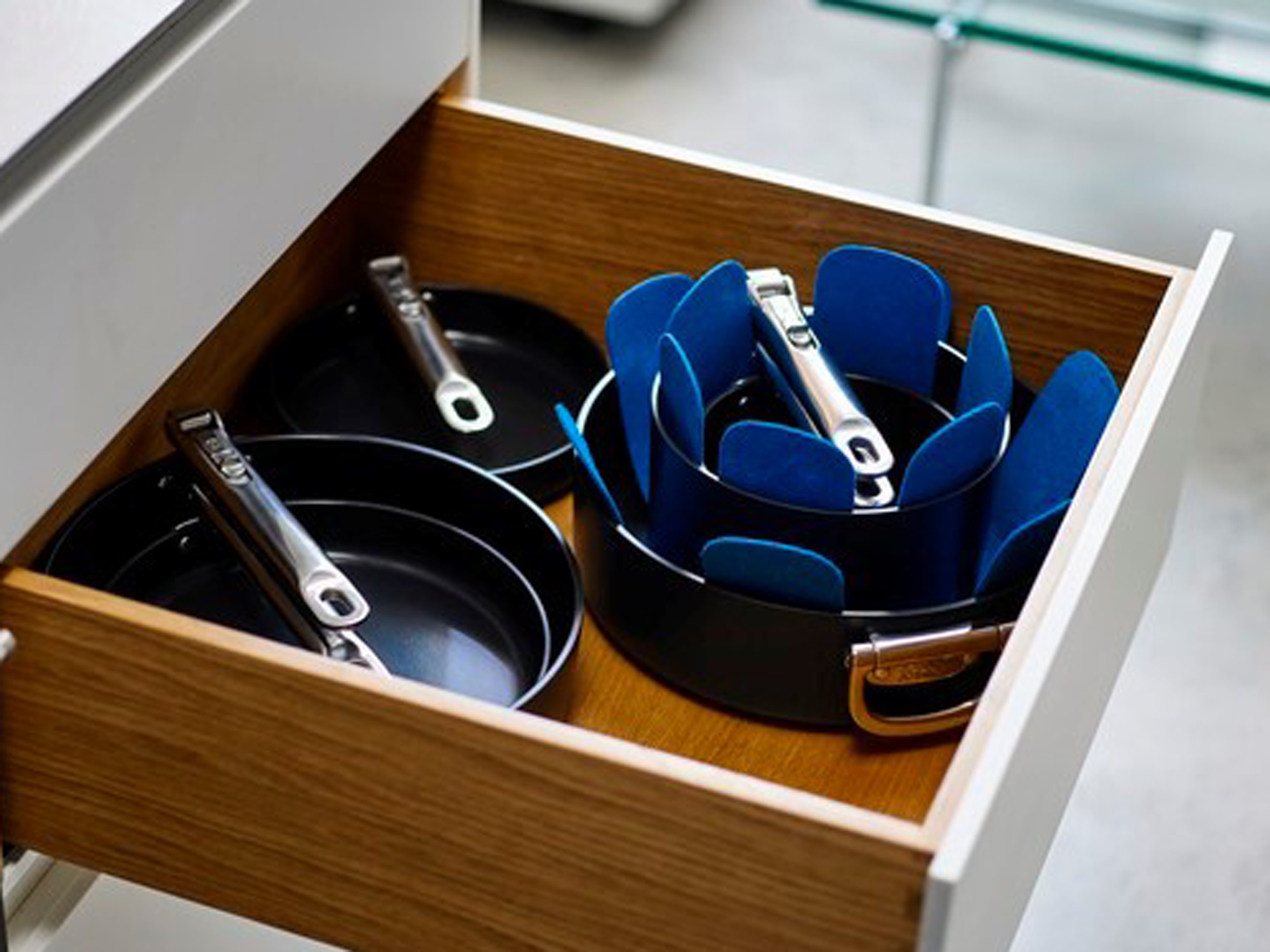 Przekładki do naczyń z kolekcji Space i nie tylko. Wykonane z filcu, zapobiegają zarysowaniom i poważniejszym uszkodzeniom garnków, patelni oraz rondli. Dzięki dużej uniwersalności przydadzą się w każdej kuchni jako podstawowa ochrona w szufladach i szafkach.