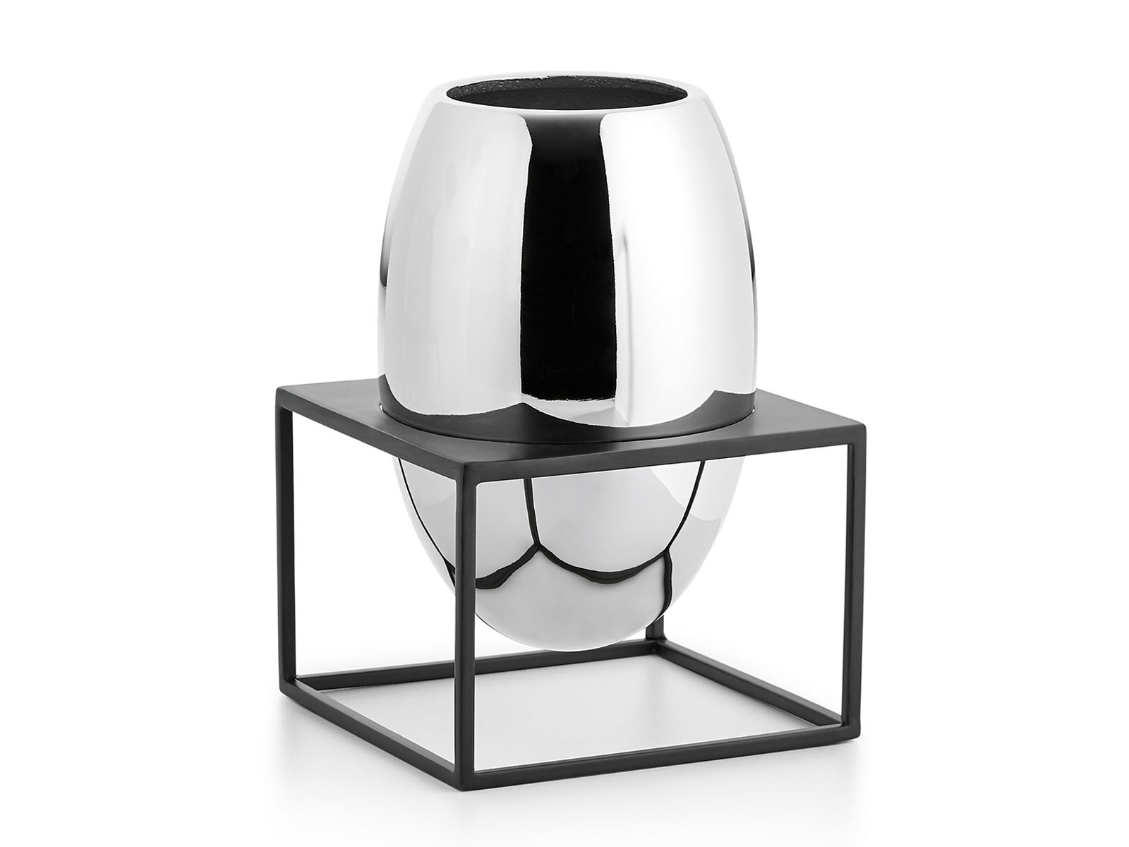 Wazon wykonany z niklowanej polerowanej na wysoki połysk stali, postawa wykonana ze stali malowanej proszkowo.