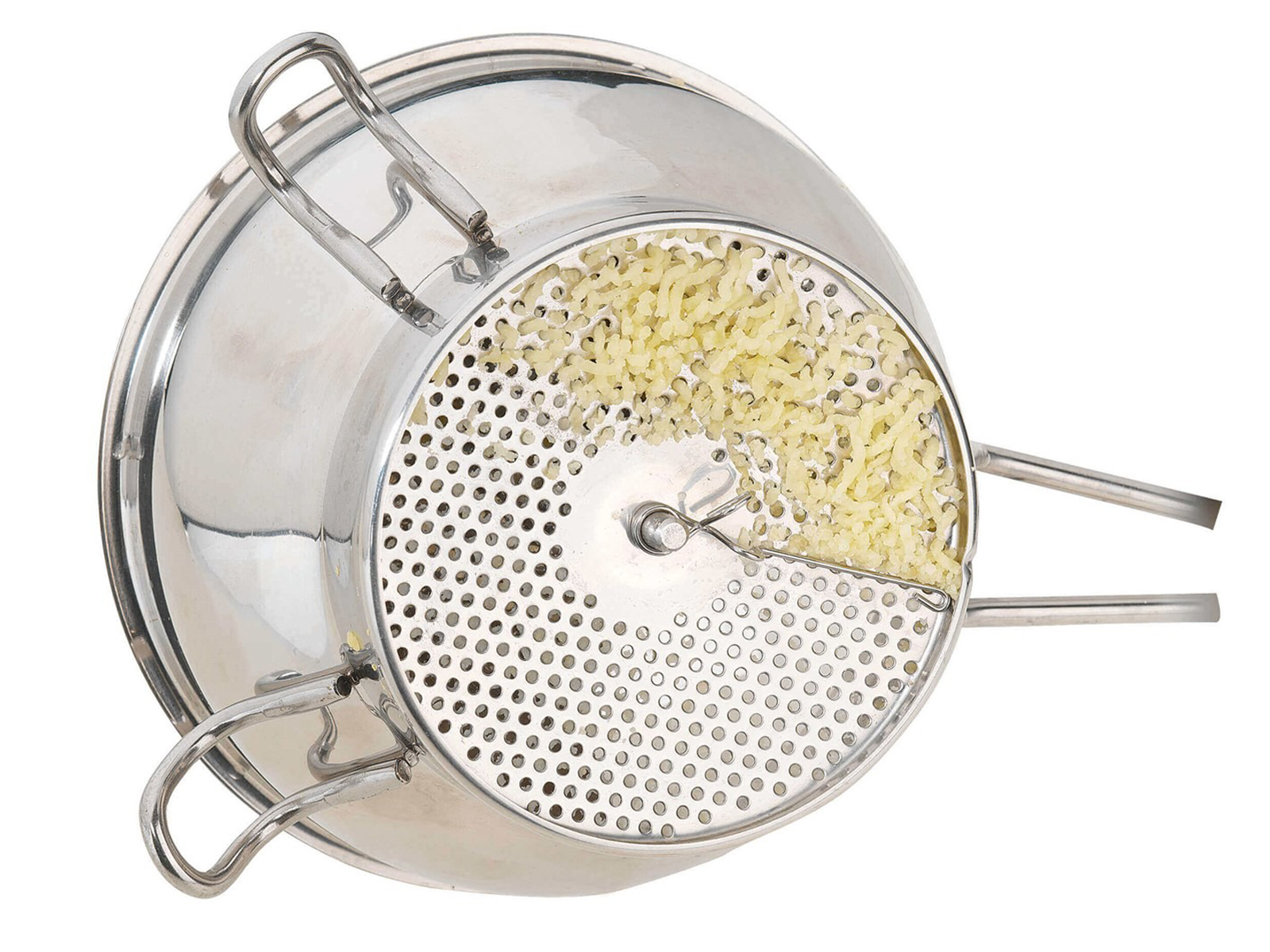 Przecierak do żywności GEFU Flotte Lotte to solidne narzędzie dla osób przygotowujących domowe przeciery. Umożliwia szybkie przygotowanie gładkich musów i puree z owoców oraz warzyw. Wyposażony w 2 wymienne dyski o perforacji 2 mm i 3 mm, pozwala dopasować strukturę potrawy do różnorodnych potrzeb. Skrobak po zewnętrznej stronie sprawia, że produkt zostaje wykorzystany w całości, bez strat. Całość wykonano z wysokiej jakości stali nierdzewnej, a możliwość mycia w zmywarce podnosi komfort jego użytkowania.
