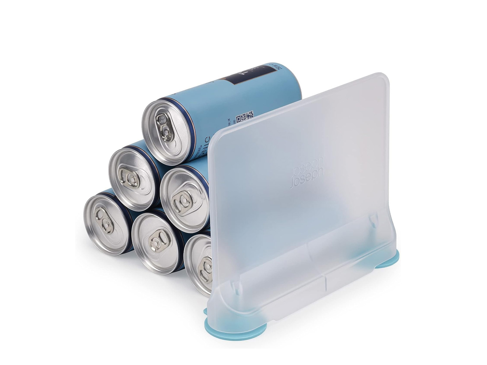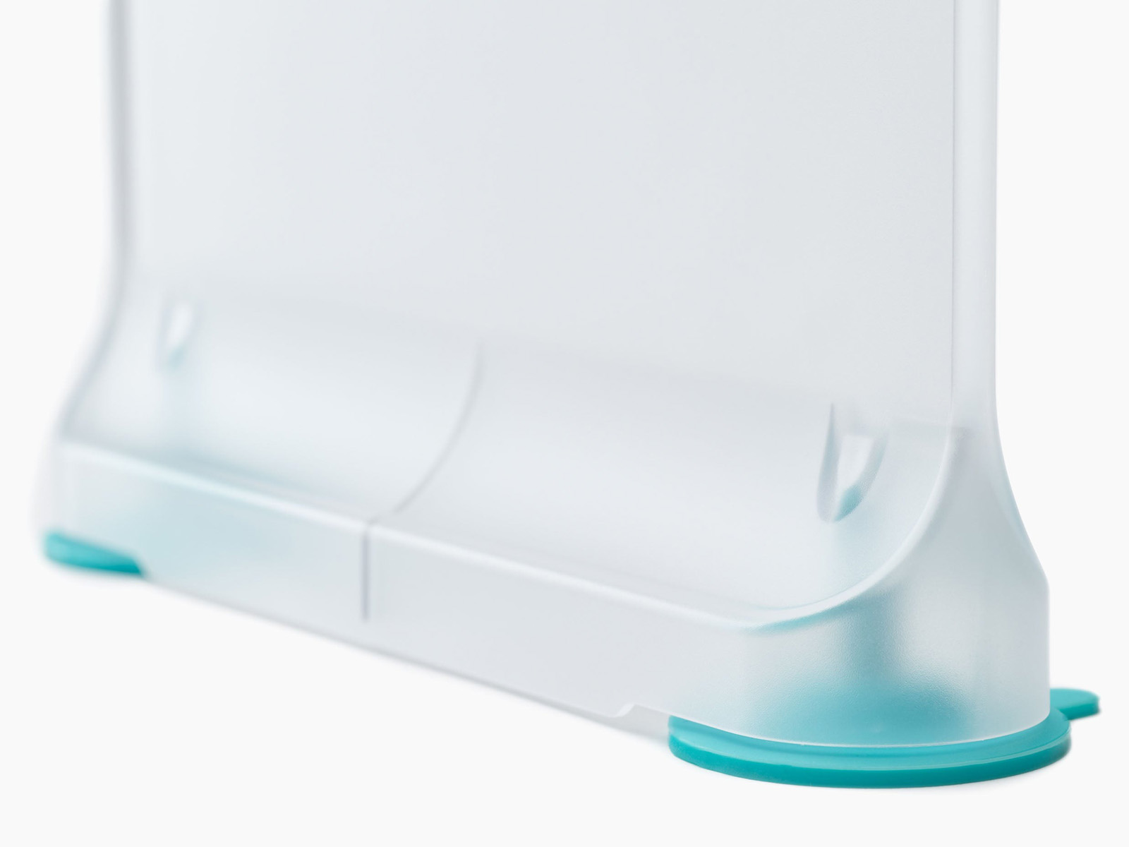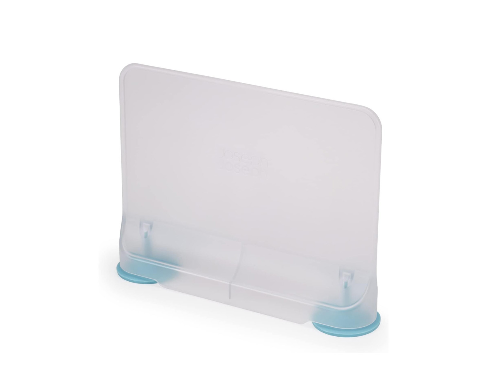 Przegroda wykonana z tworzywa sztucznego wolnego od BPA w formie prostokątnej ścianki łatwo mocowanej do półki za pomocą 2 przyssawek.
