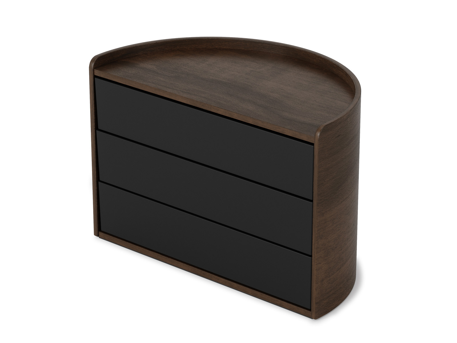 Półkolista obudowa pudełka o widocznej strukturze drewna, półeczki w kolorze jednolitym.