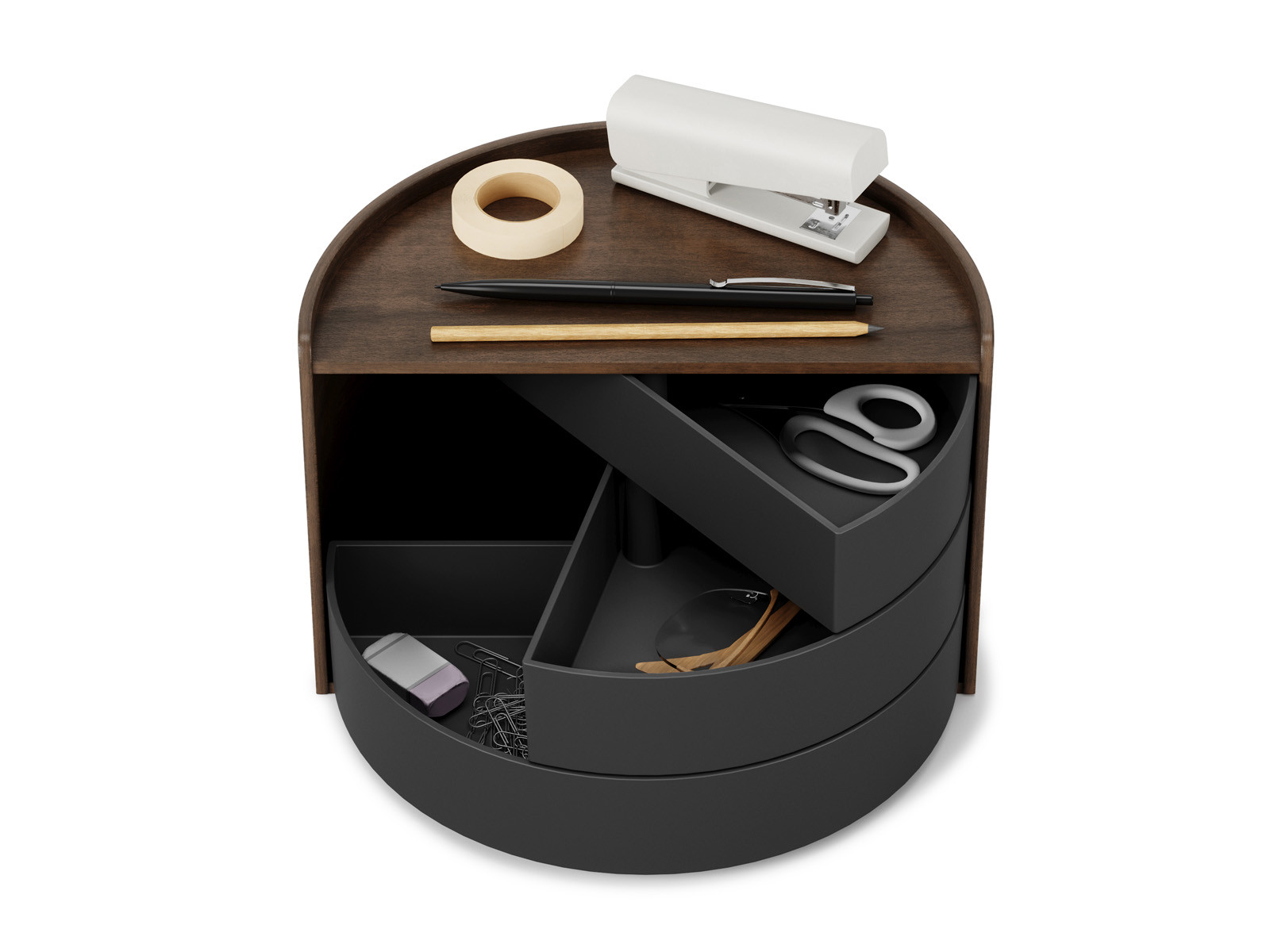 Pudełko posiada 3 obrotowo rozkładane szufladki oraz na powierzchni tackę do przechowywania mniejszych akcesoriów, perfum, małych roślin lub innych niewielkich przedmiotów osobistych.