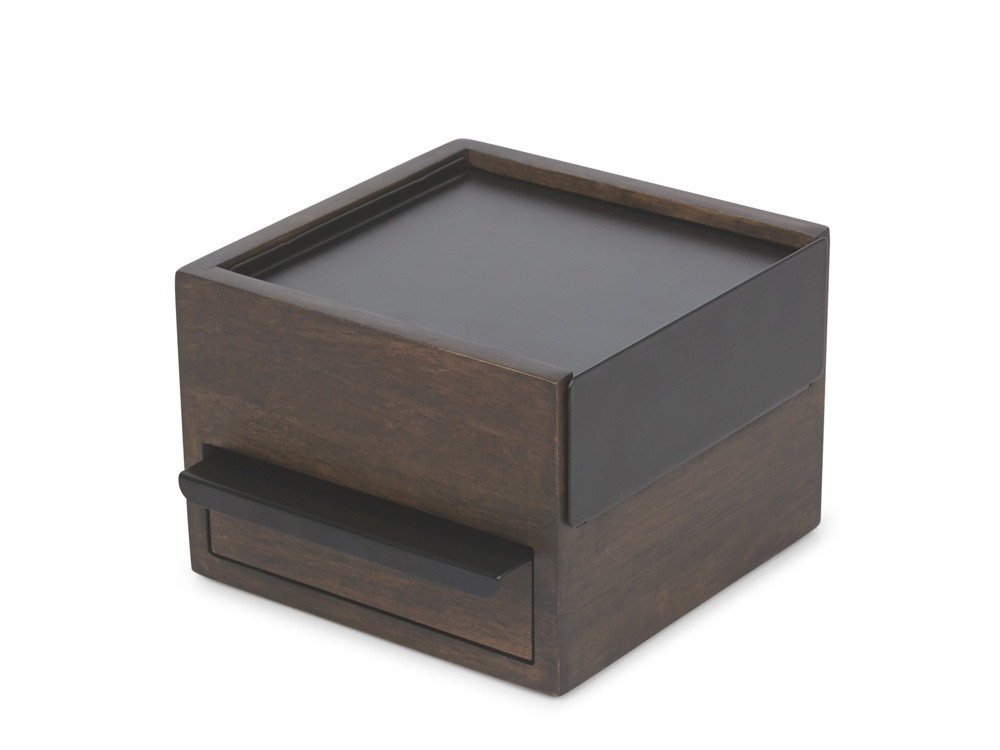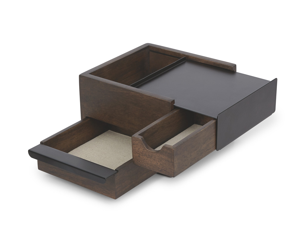 Eleganckie i praktyczne rozkładane drewniano-metalowe pudełko do przechowywania biżuterii i drobiazgów. Pudełko dwupoziomowe z trzema różnej wielkości wysuwanymi szufladkami.