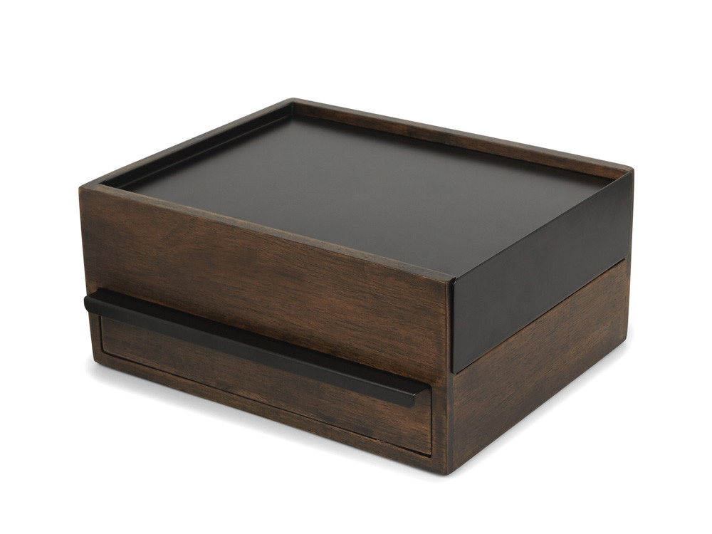 Pudełko dwupoziomowe z trzema różnej wielkości wysuwanymi szufladkami wyłożonymi ochronnym materiałem.