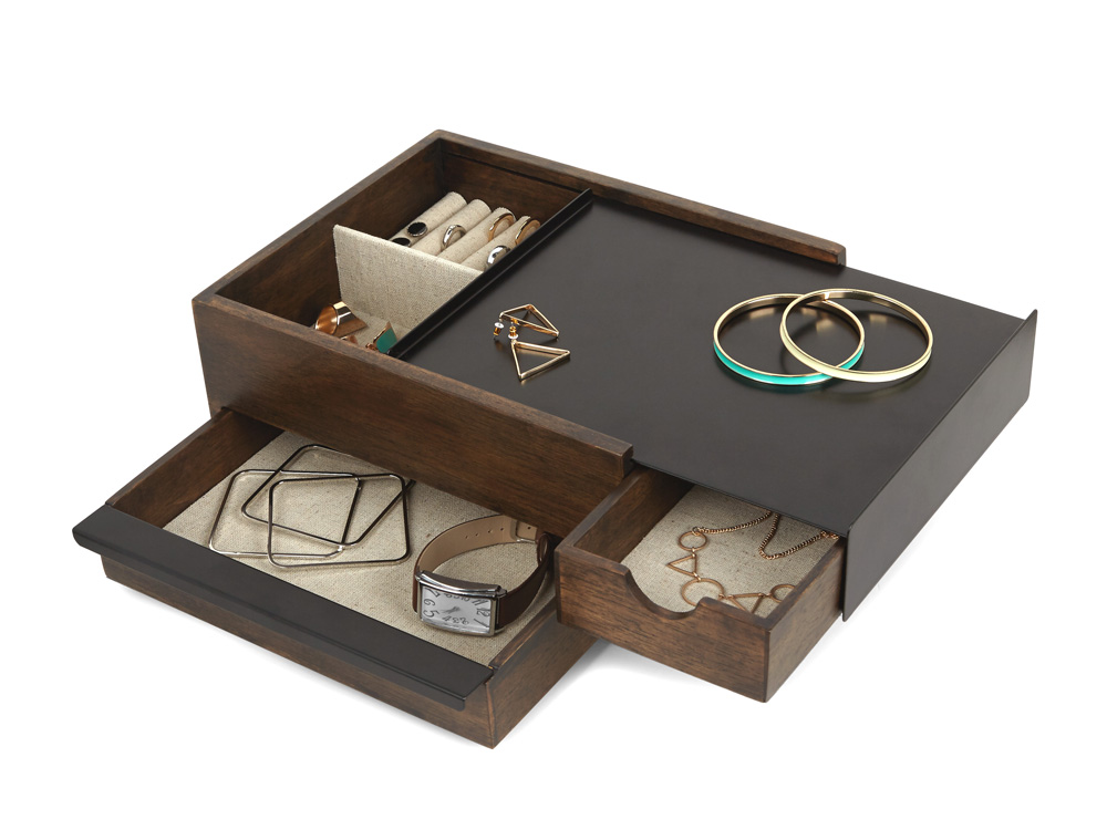 Eleganckie duże rozkładane drewniano-metalowe pudełko do przechowywania biżuterii i drobiazgów.