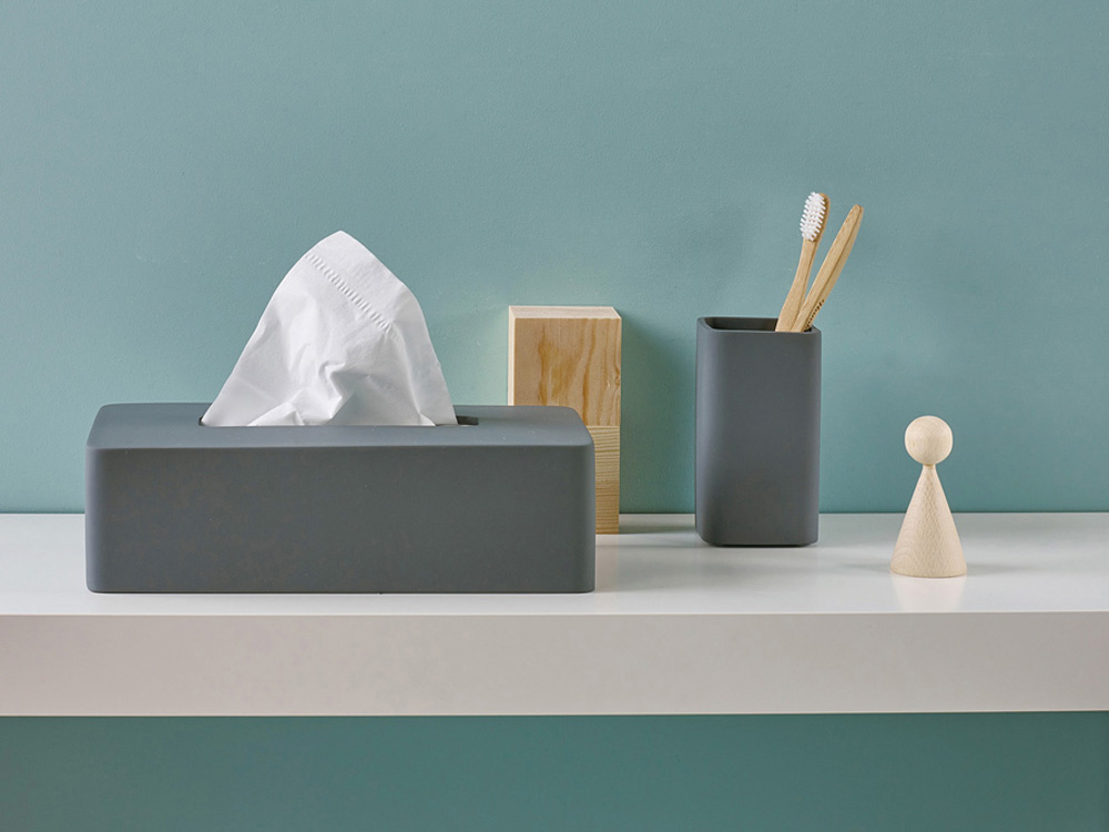 Pudełko na chusteczki z kolekcji Ona, podobnie jak pozostałe elementy kolekcji charakteryzuje się bardzo prostym, a jednocześnie oryginalnym designem, Oparta na planie kwadratu oraz prostokąta z zaokrąglonymi pionowymi krawędziami.