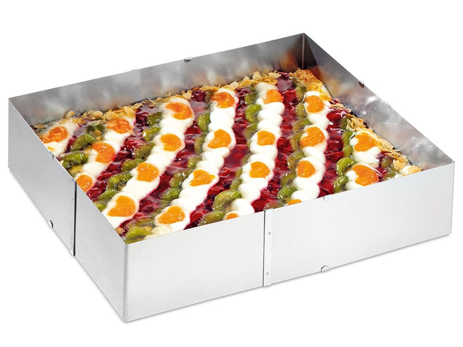 Ramka GEFU Uno to uniwersalna forma do tworzenia ciast i pizz o różnych rozmiarach, dzięki regulowanemu obwodowi od 20 cm x 24 cm do 38 cm x 46 cm. Wysoka krawędź o wysokości 8,5 cm skutecznie zapobiega wypływaniu ciasta, nawet przy wypiekach z dużą ilością dodatków. Stalowa konstrukcja dopasowuje się do wszystkich dostępnych na rynku blach do pieczenia oraz cechuje się odpornością na odkształcanie i korozję. Możliwość całkowitego rozłożenia ramki znacznie ułatwia czyszczenie jej w ręce lub zmywarce.