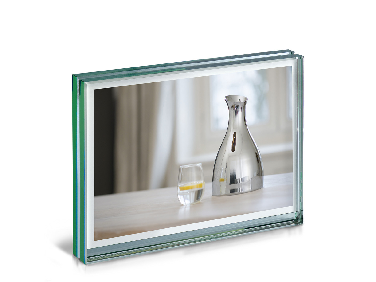 Elegancka oryginalna nablatowa ramka na zdjęcia o minimalistycznym nowoczesnym designie w całości wykonana ze szkła.