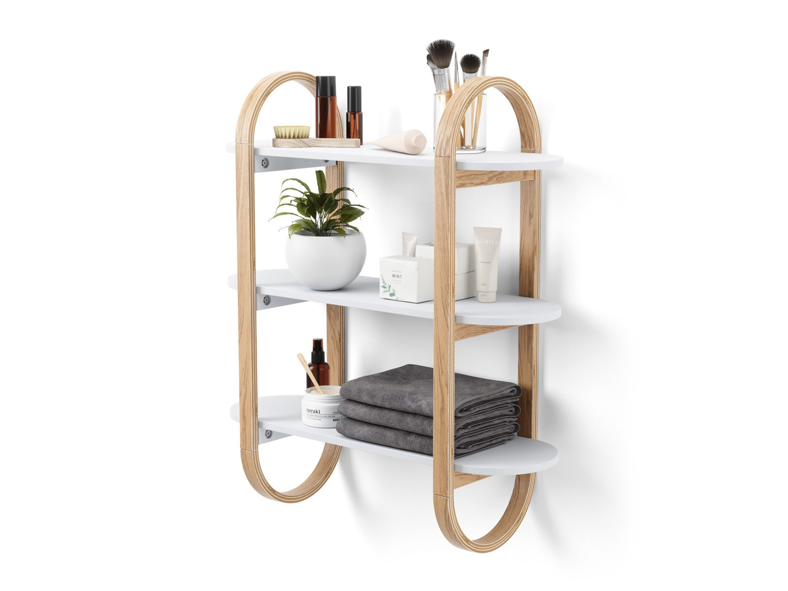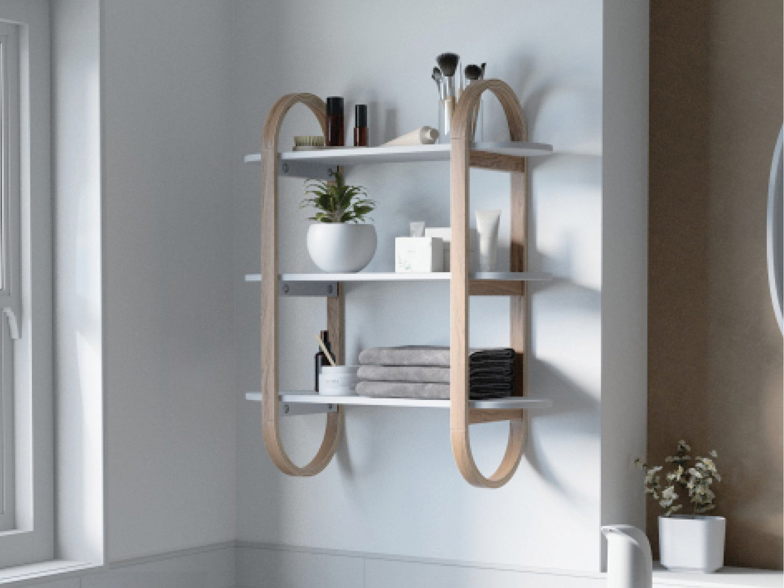 Boczne wsporniki półek wykonane z giętego drewna i połączone na końcach na półokrągło.