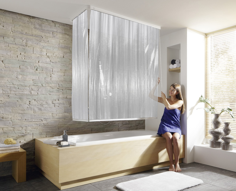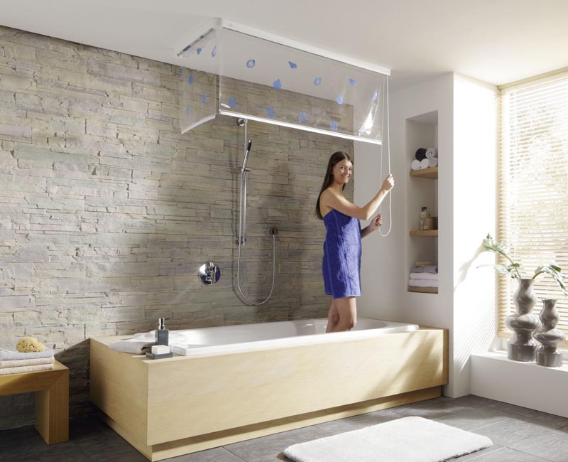 Duschrollo to kolekcja rolet do wanny, które z powodzeniem mogą zastąpić zasłony prysznicowe. Bardzo estetyczne, po zwinięciu chowające się w kasetach montowanych pod sufitem, dzięki czemu nie zajmują miejsca i nie zakłócają porządku w łazience.