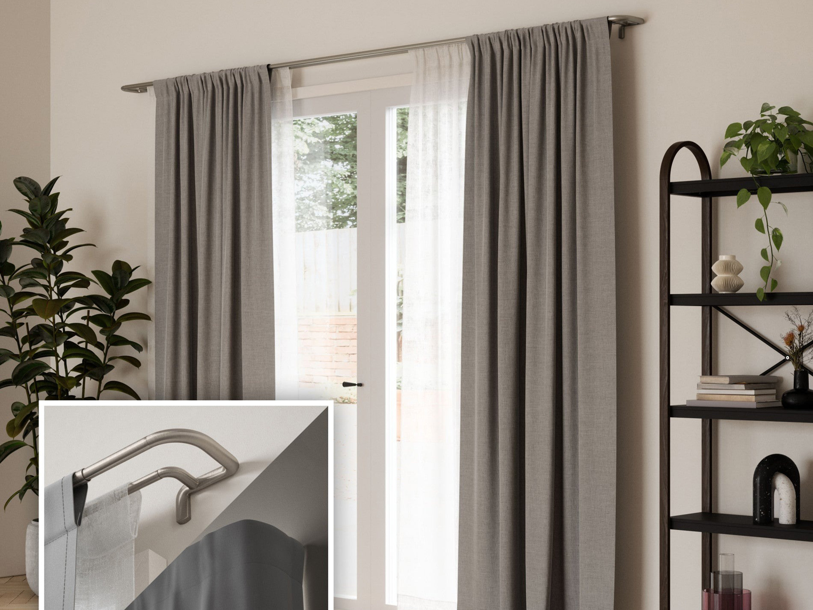 Poprzeczka karnisza zewnętrzna do zasłon o średnicy 1,9 cm, poprzeczka wewnętrzna do firan o średnicy 1,5 cm, zakończone po obu stronach wygięciem, które zapewnia zaciągniecie firan i zasłon do samej ściany.