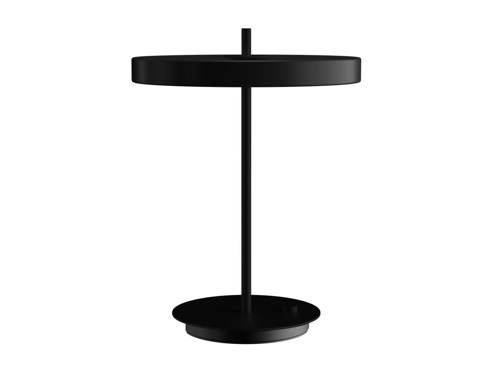 Klosz lampy okrągły płaski wykonany z malowanego proszkowo metalu z okrągłą podstawą i słupkiem w czarnym kolorze, włącznik znajduje się na podstawie lampy.