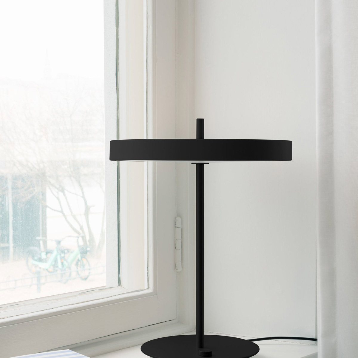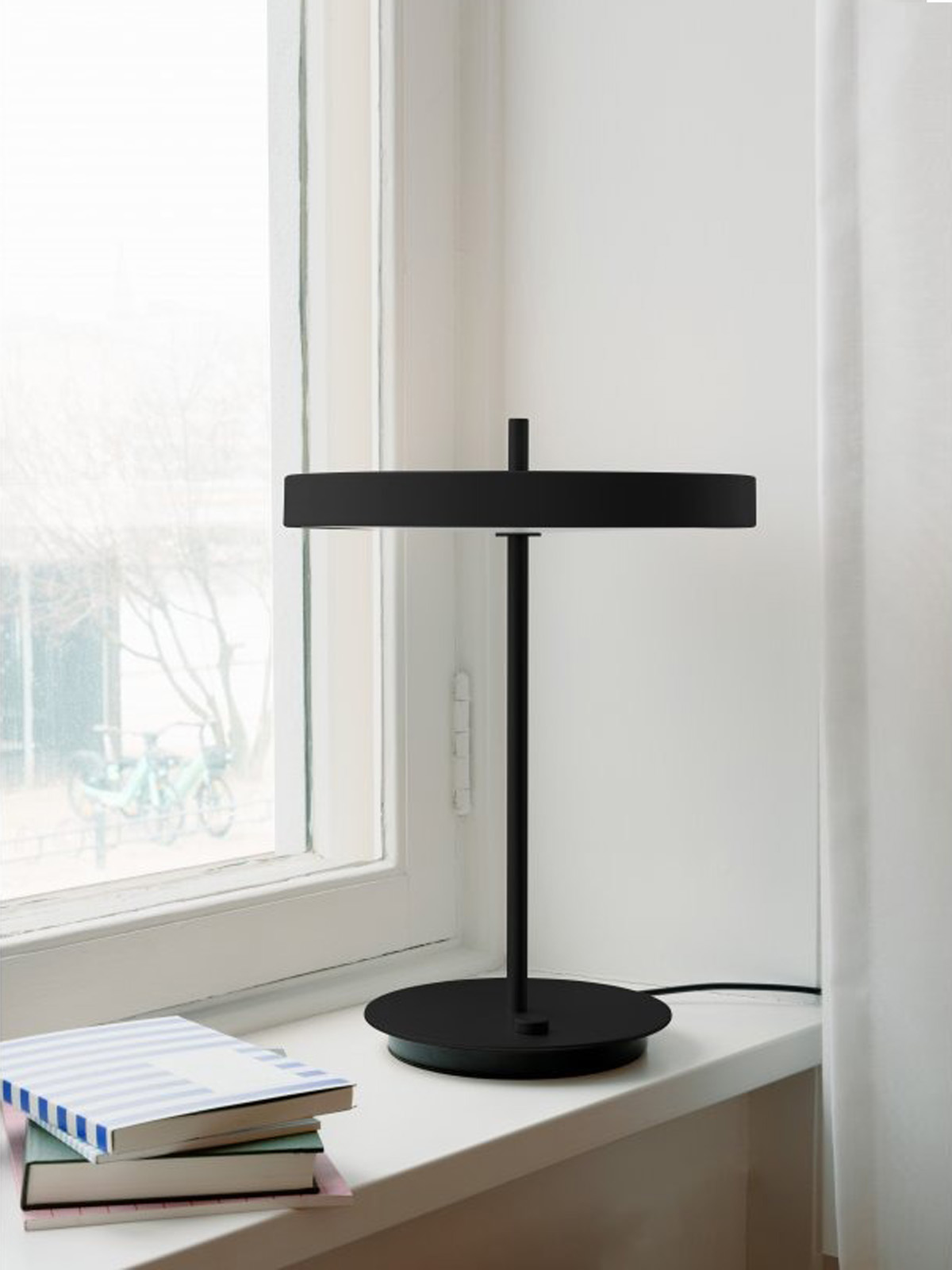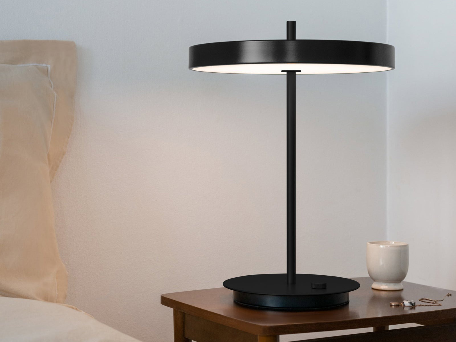 Elegancka minimalistyczna nablatowa lampa LED ze smukłym metalowym kloszem, idealna na boczny stolik, komodę, biurko lub szafkę nocną.