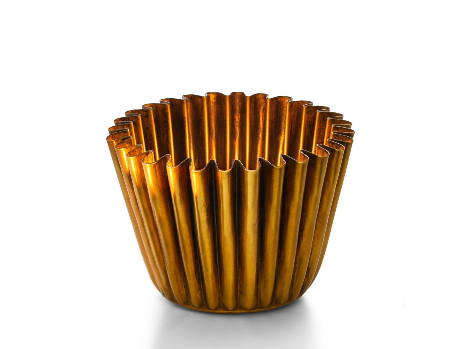 Świecznik o profilowanych pofalowanych bokach, wykonany z żelaza pokrytego antycznym mosiądzem.