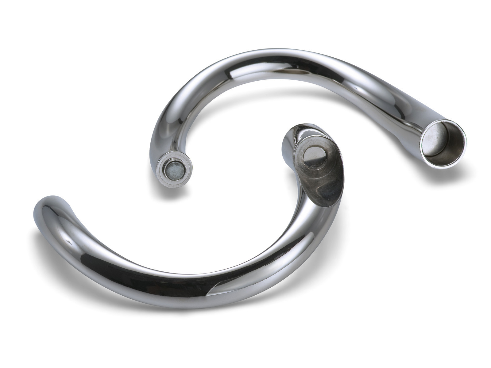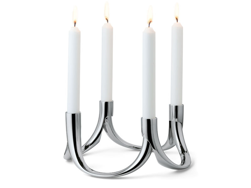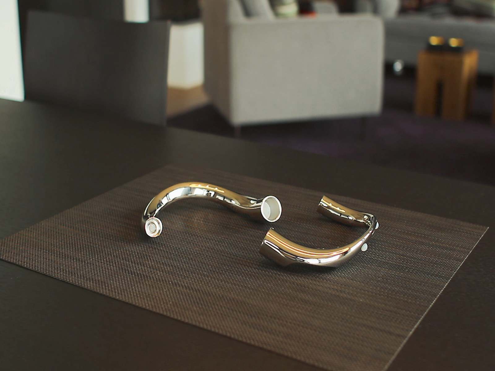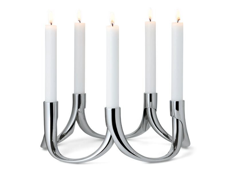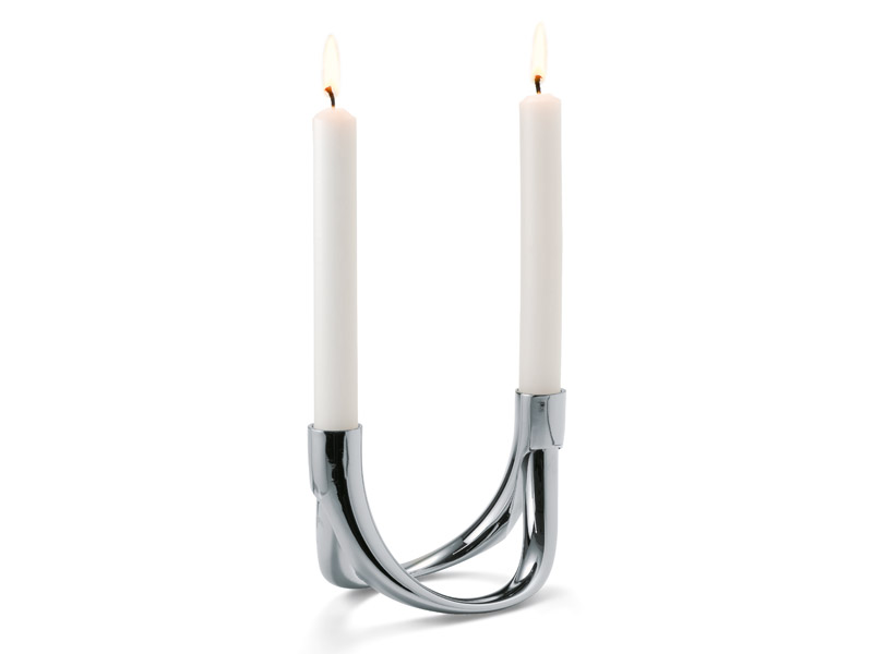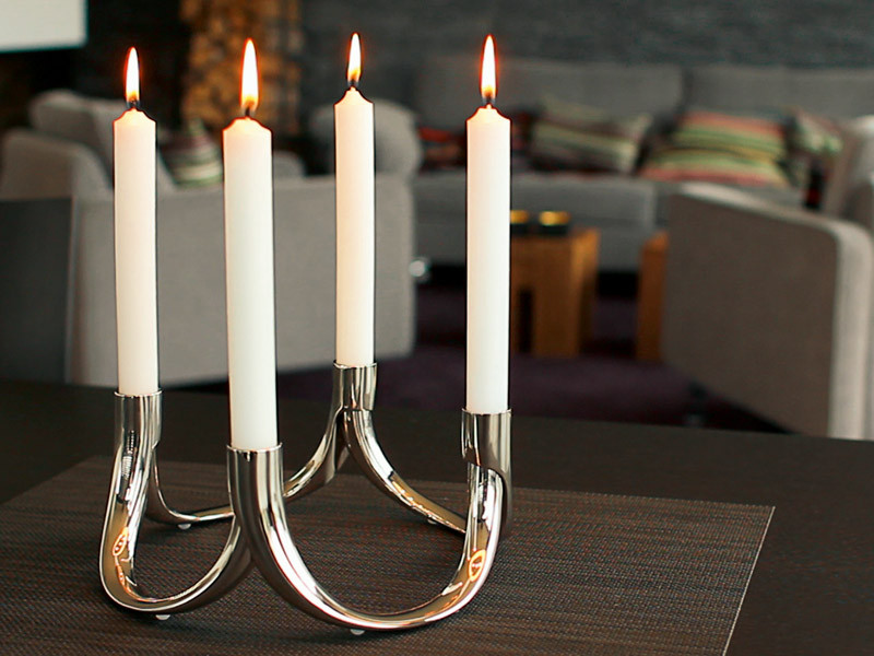 Świecznik wykonany jest z polerowanego niklu i składa się z łukowatych "modułów", które łączą się za pomocą sprytnie ukrytych magnesów.