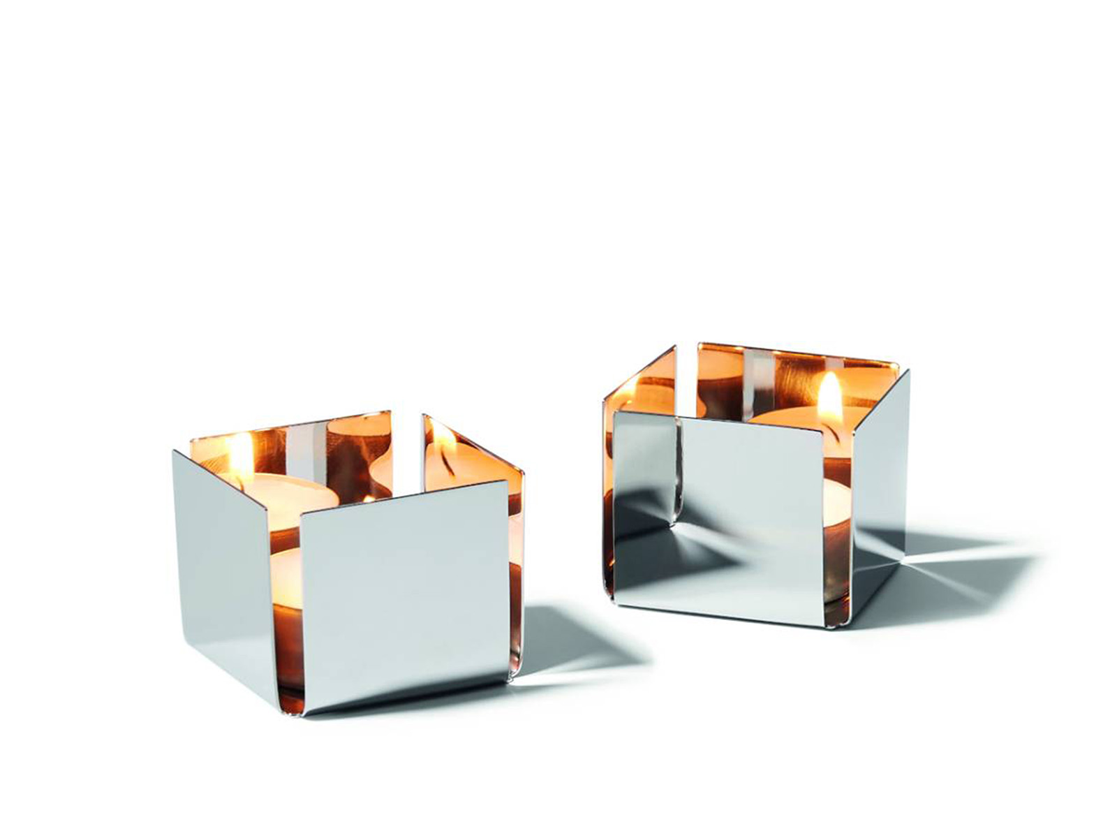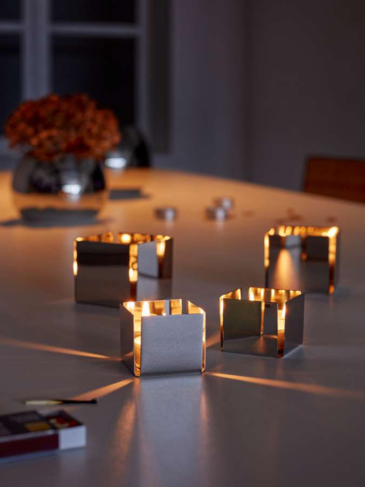 Otwarte krawędzie nadają świecznikom wyjątkowego designu i wraz z błyszczącymi płaszczyznami ścian pomnażają palące się w środku płomienie oraz odbijają je wewnątrz i na zewnątrz, zalewając pomieszczenie czarującą przytulną grą świateł.