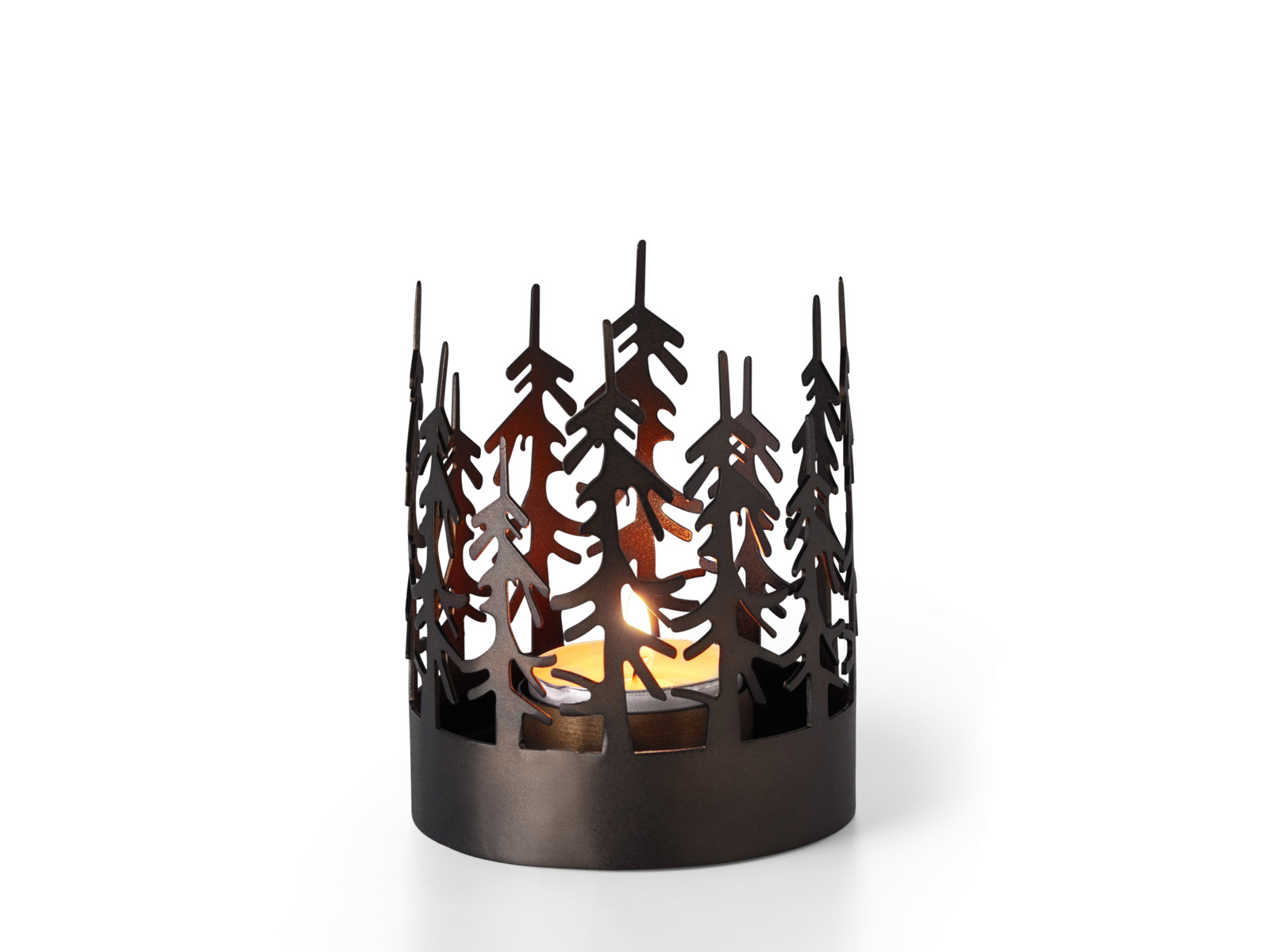 Świecznik w cylindrycznym kształcie z brzegami z wyciętym ażurowym wzorem choinek - świeca ustawiana w środku daje wyjątkowy teatralny efekt gry światła i cienia.
