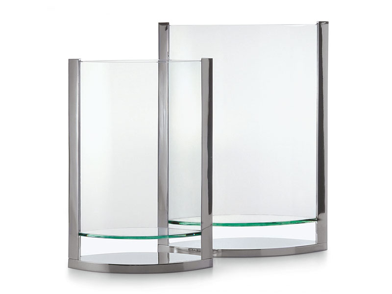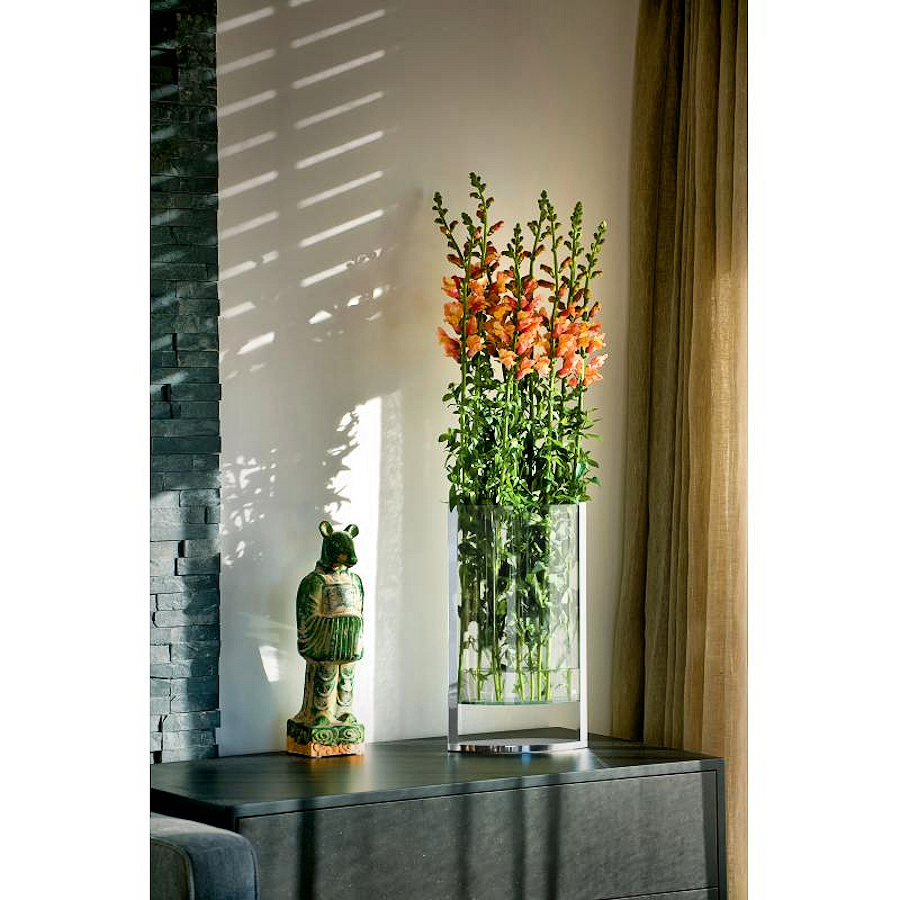 Wazon z pojemnikiem wykonanym z przezroczystego bezbarwnego szkła osadzonym w metalowej oprawie - metalowe zakończenia boków oraz podstawa wykonane z chromowanego stopu cynku.