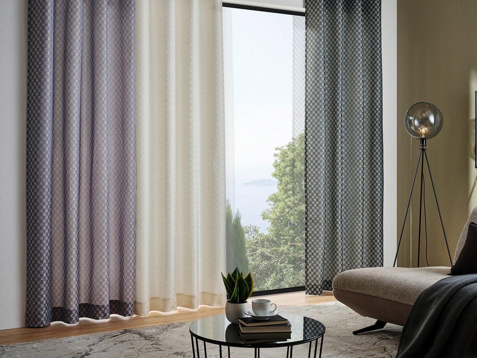 Zasłony Joop Allover mocowane są na karniszach za pomocą wszytych kółek