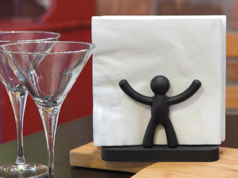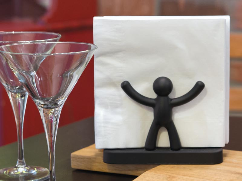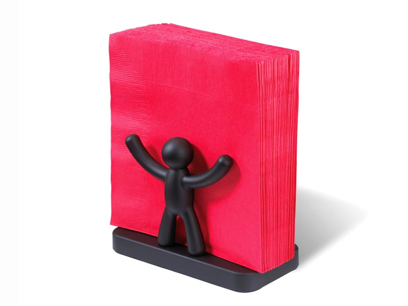 Oryginalny i zabawny serwetnik z tworzywa sztucznego ozdobiony miniaturką "ludzika", który podtrzymuje całym sobą górujące nad nim serwetki.