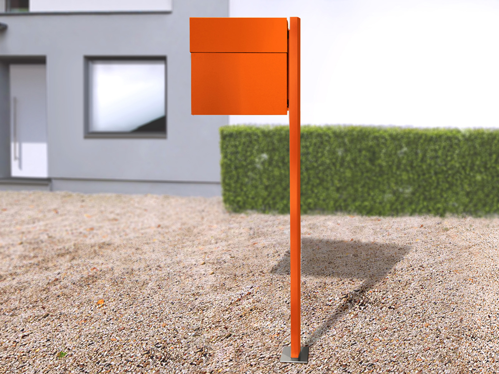 Elegancka stojąca metalowa skrzynka na listy umocowana na słupku montowanym do podłoża.