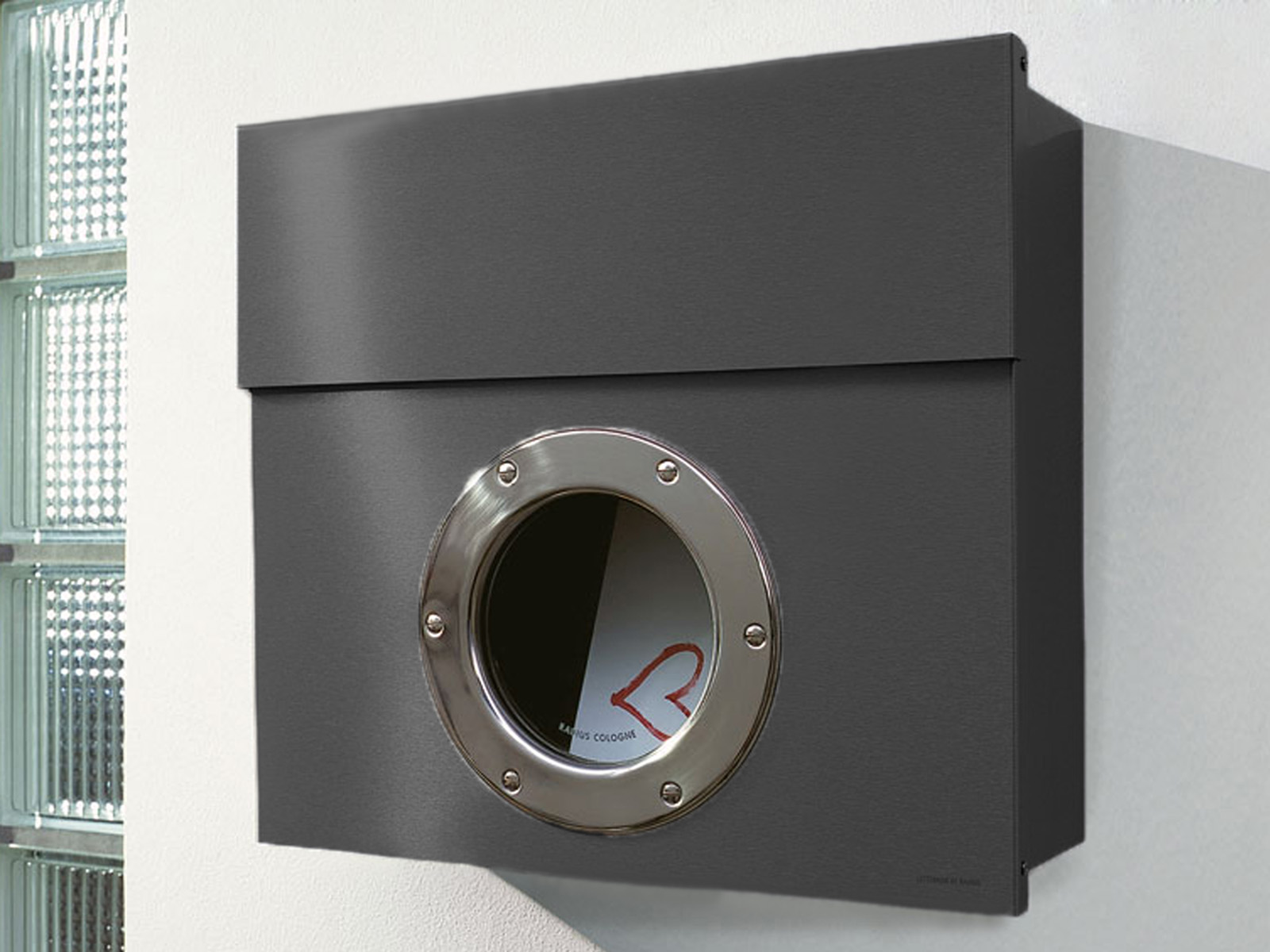 Elegancka i oryginalna metalowa skrzynka na listy z efektownym okrągłym okienkiem.