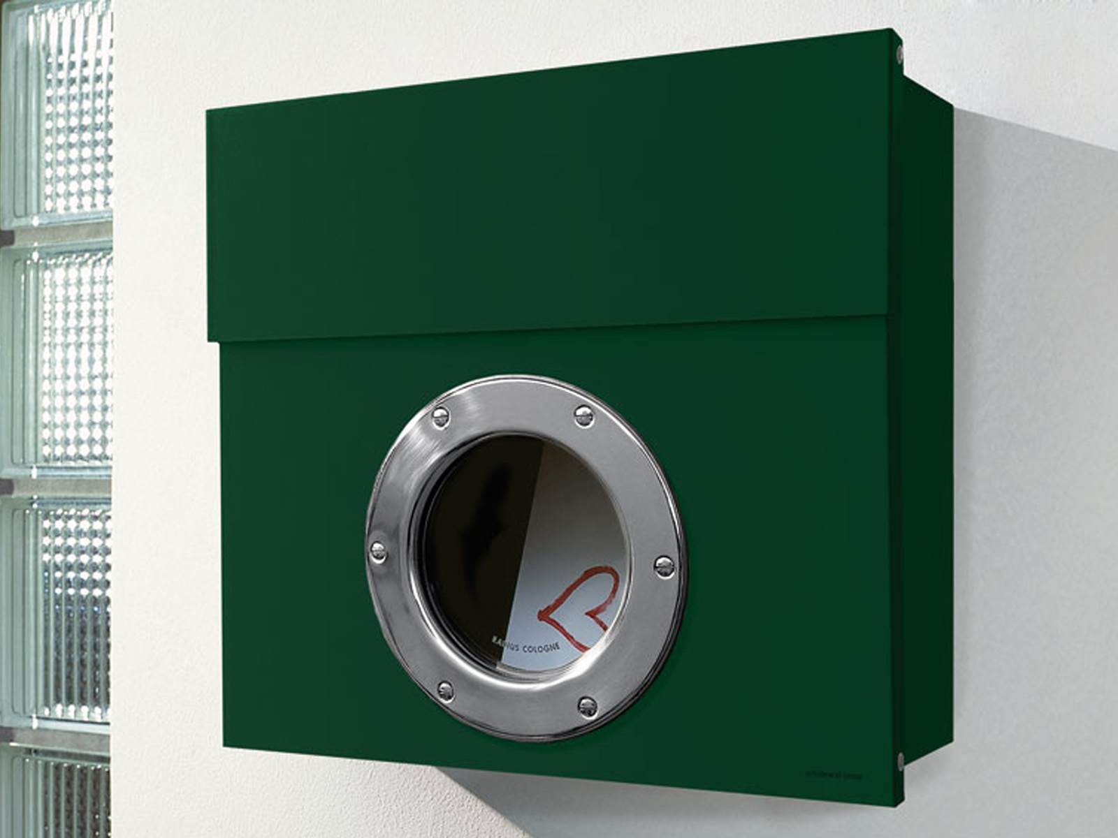 Przednia ścianka skrzynki posiada okrągłe szklane okienko z ozdobnym brzegiem przypominające bulaj, które umożliwia identyfikację z zewnątrz czy w skrzynce znajdują się listy.