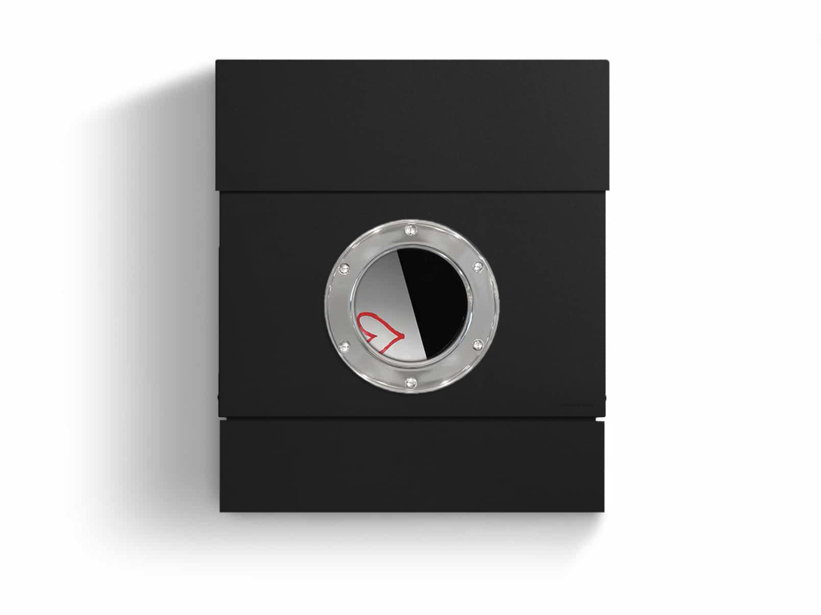 Elegancka i oryginalna metalowa skrzynka na listy z efektownym okrągłym okienkiem oraz gazetownikiem.