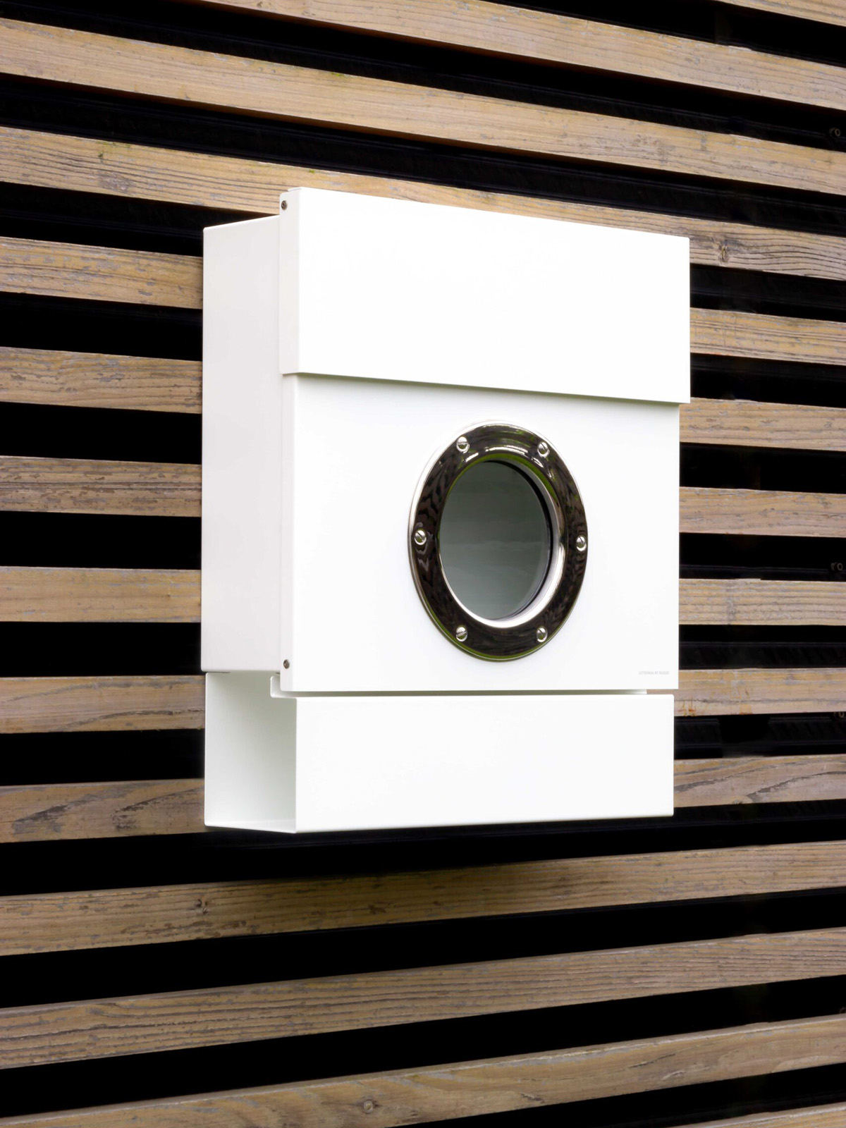 Elegancka i oryginalna metalowa skrzynka na listy z efektownym okrągłym okienkiem oraz gazetownikiem.