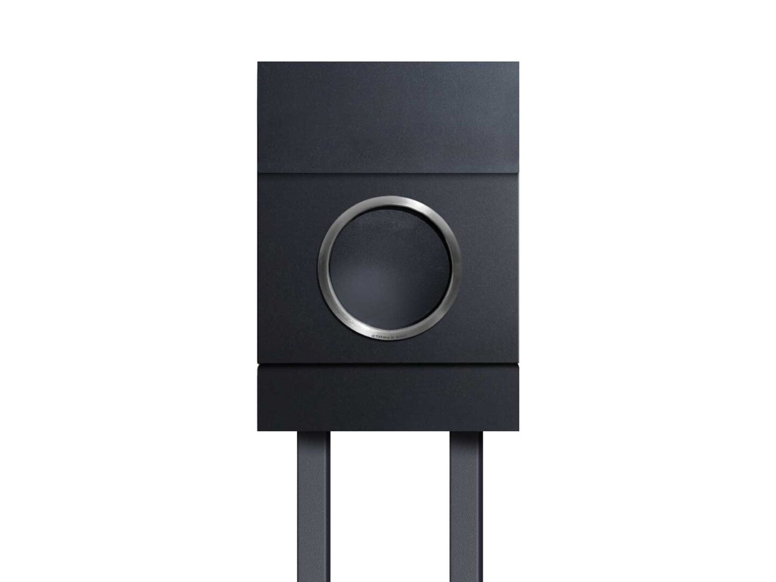 Elegancka stojąca metalowa smukła skrzynka na listy z okrągłym okienkiem oraz gazetownikiem.