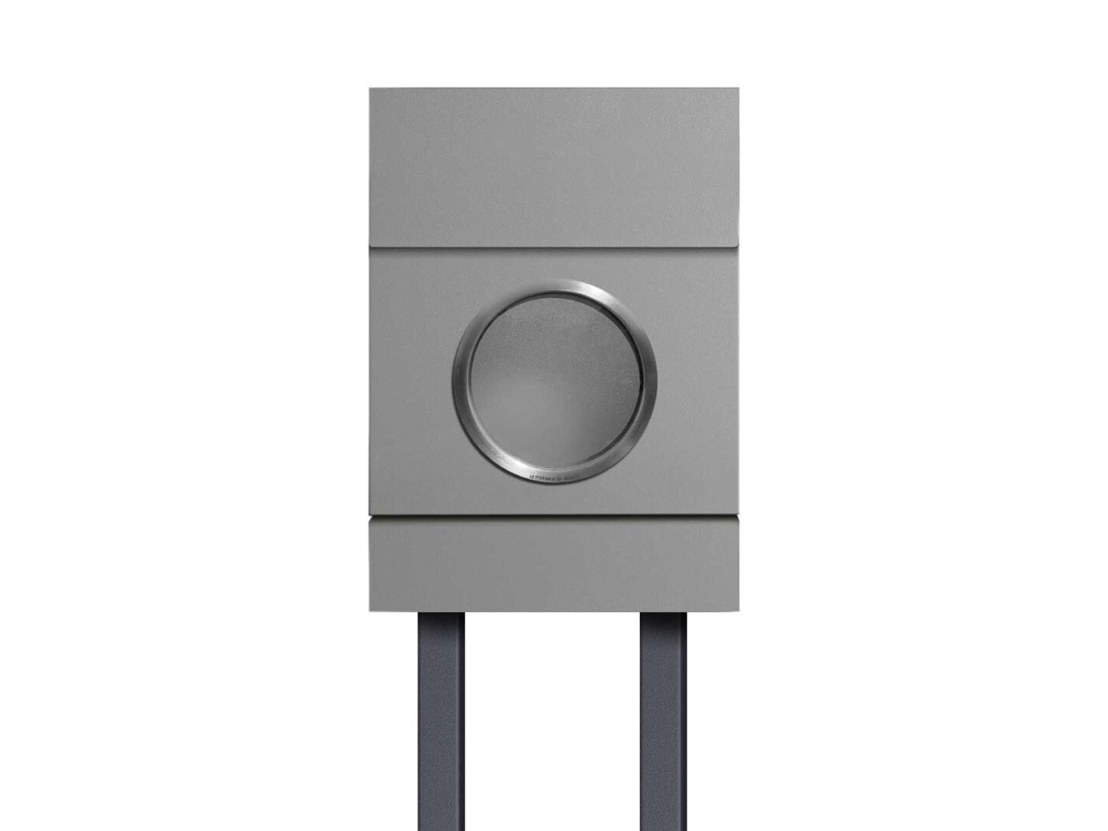 Elegancka stojąca metalowa smukła skrzynka na listy z okrągłym okienkiem oraz gazetownikiem.