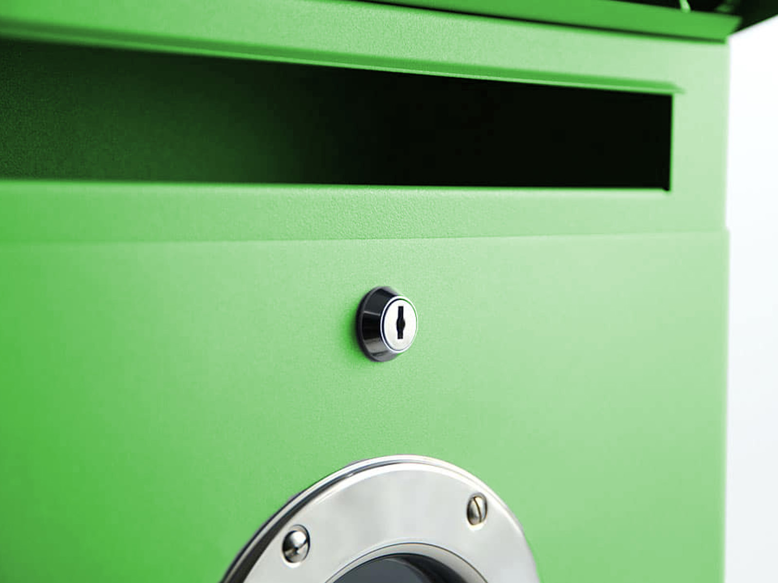 Skrzynka zamykana na zamek z kluczykiem, wyjęcie korespondencji możliwe jest po otwarciu zamka i odchyleniu przedniej ścianki.