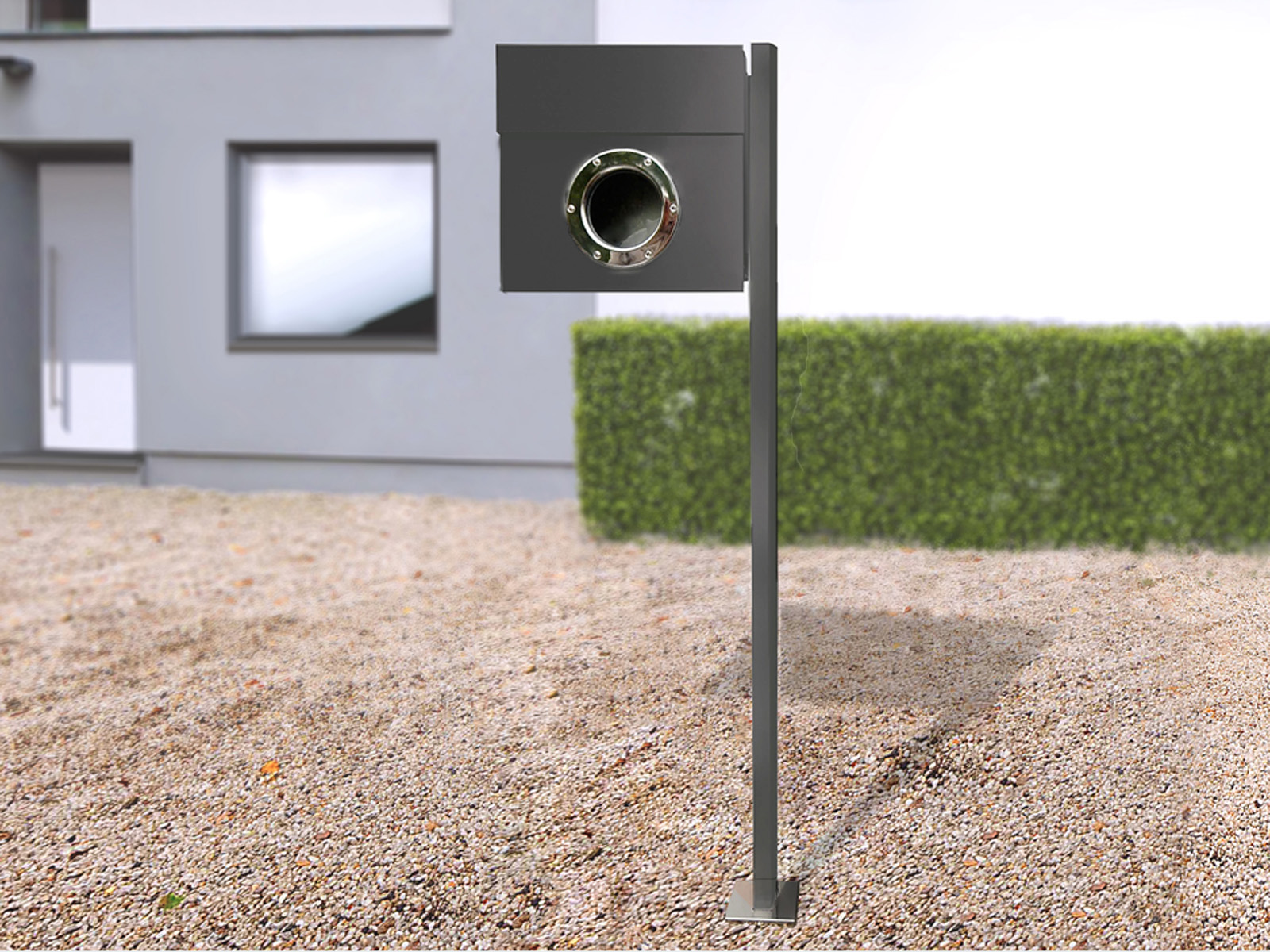 Elegancka i oryginalna stojąca metalowa skrzynka na listy z efektownym okrągłym okienkiem.