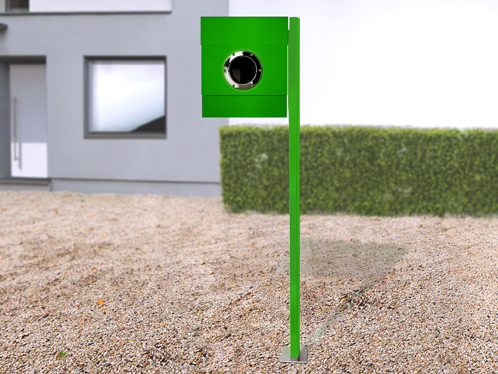 EElegancka i oryginalna stojąca metalowa skrzynka na listy z efektownym okrągłym okienkiem oraz gazetownikiem.