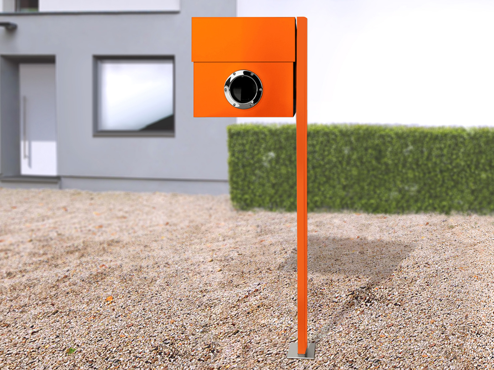 Elegancka i oryginalna stojąca metalowa skrzynka na listy XXL z efektownym okrągłym okienkiem oraz wewnętrznym gazetownikiem.