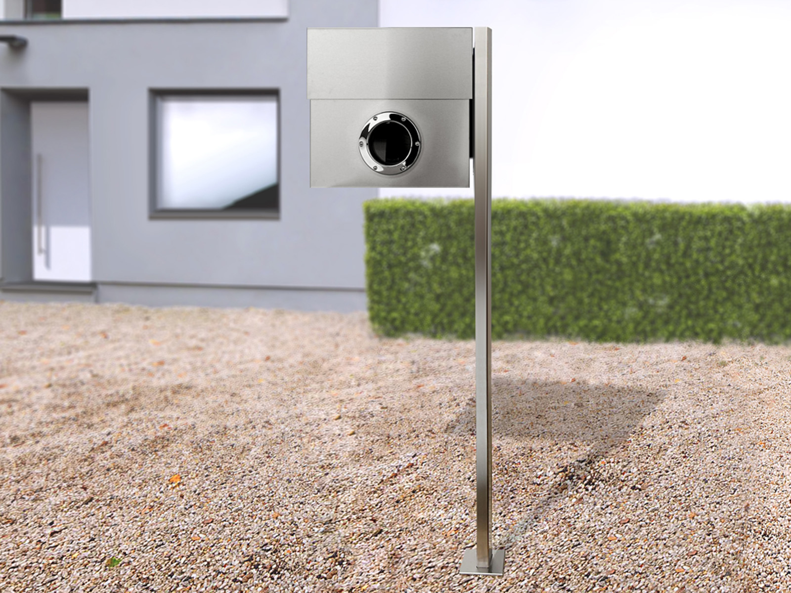 Elegancka i oryginalna stojąca metalowa skrzynka na listy XXL z efektownym okrągłym okienkiem oraz wewnętrznym gazetownikiem.