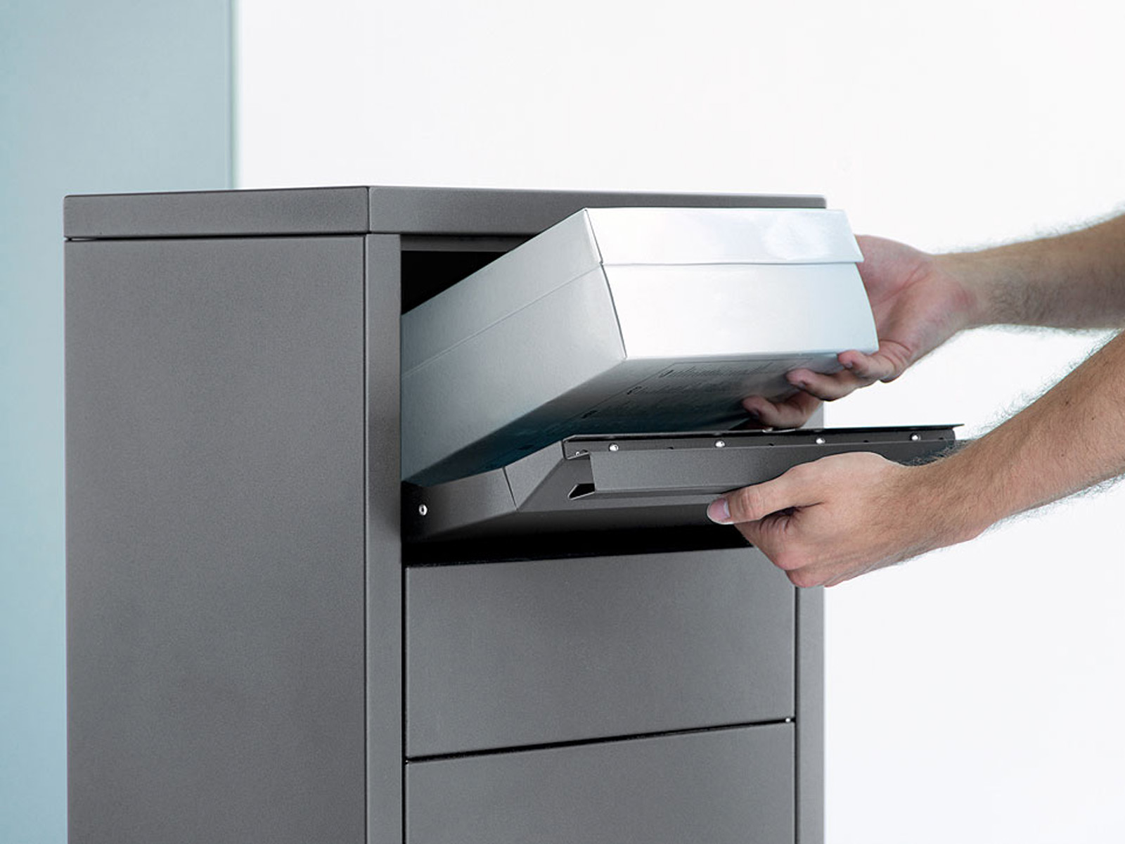 Szeroki otwór wrzutowy umożliwia umieszczanie w skrzynce również dużych kopert (listów lub przesyłek) bez konieczności ich składania.
