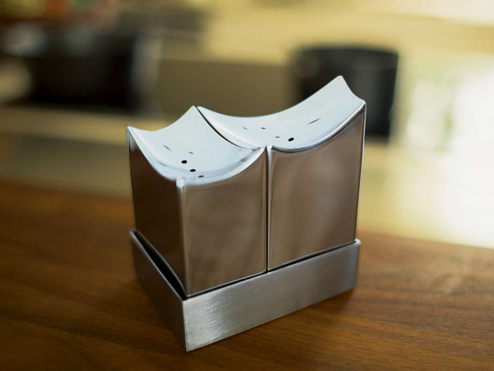 Solniczka i pieprzniczka o niezwykle oryginalnej formie wzorowanej na budynku filharmonii z nad rzeki Elbe w Hamburgu - pojemniki pojedynczo przypominają współczesną rzeźbę, ułożone razem na dopasowanej podstawce, tworzą miniaturową podobiznę budynku Elbphilharmonie z jej charakterystycznym falistym dachem.