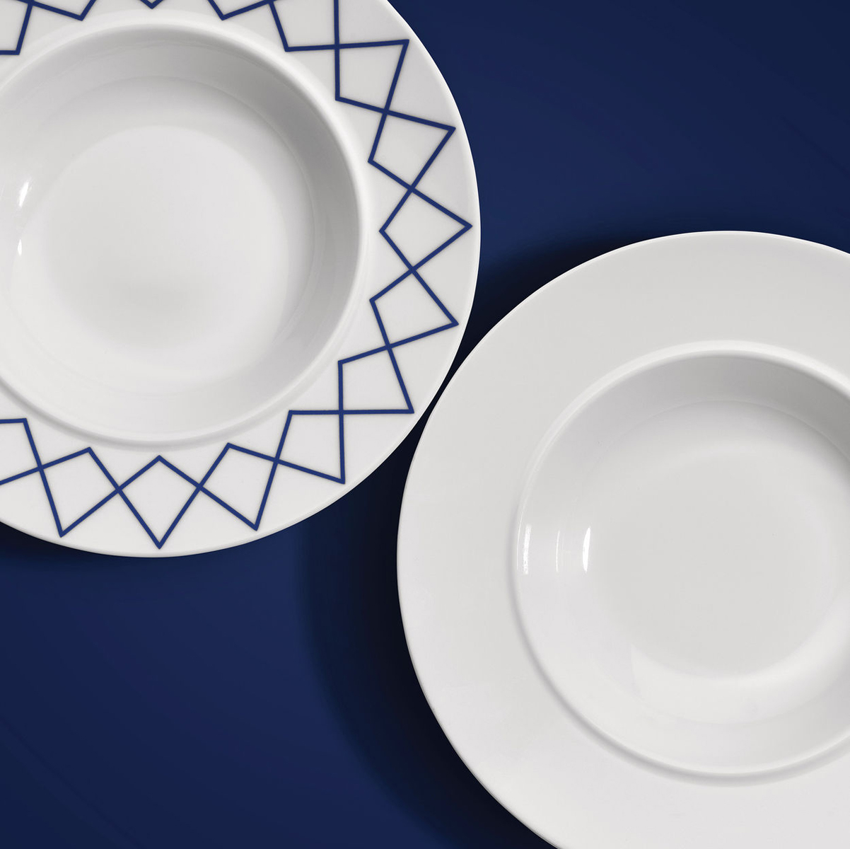 My Beautiful China przyciąga wzrok geometrycznym motywem w żywym, kobaltowym błękicie. Ranty talerzy i misek zdobi łańcuch czworokątów, który nadaje całości silny rytm wizualny.
