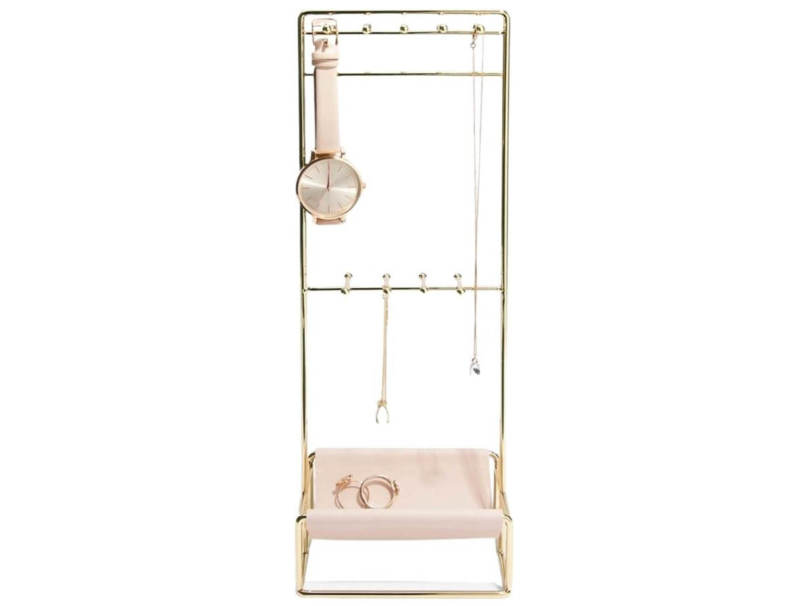 Stojak posiada łącznie 4 poziome poprzeczki - na dwóch z nich umieszczono łącznie 18 pojedynczych haczyków. Stojak posiada również pojemną tkaninową tackę u podstawy. Wszystkei te elementy sprawią, że stojak pomieści niezliczoną ilość poszczególnych elementów biżuterii - pierścionków, kolczyków, a także łańcuszków, naszyjników czy bransoletek i zegarków.