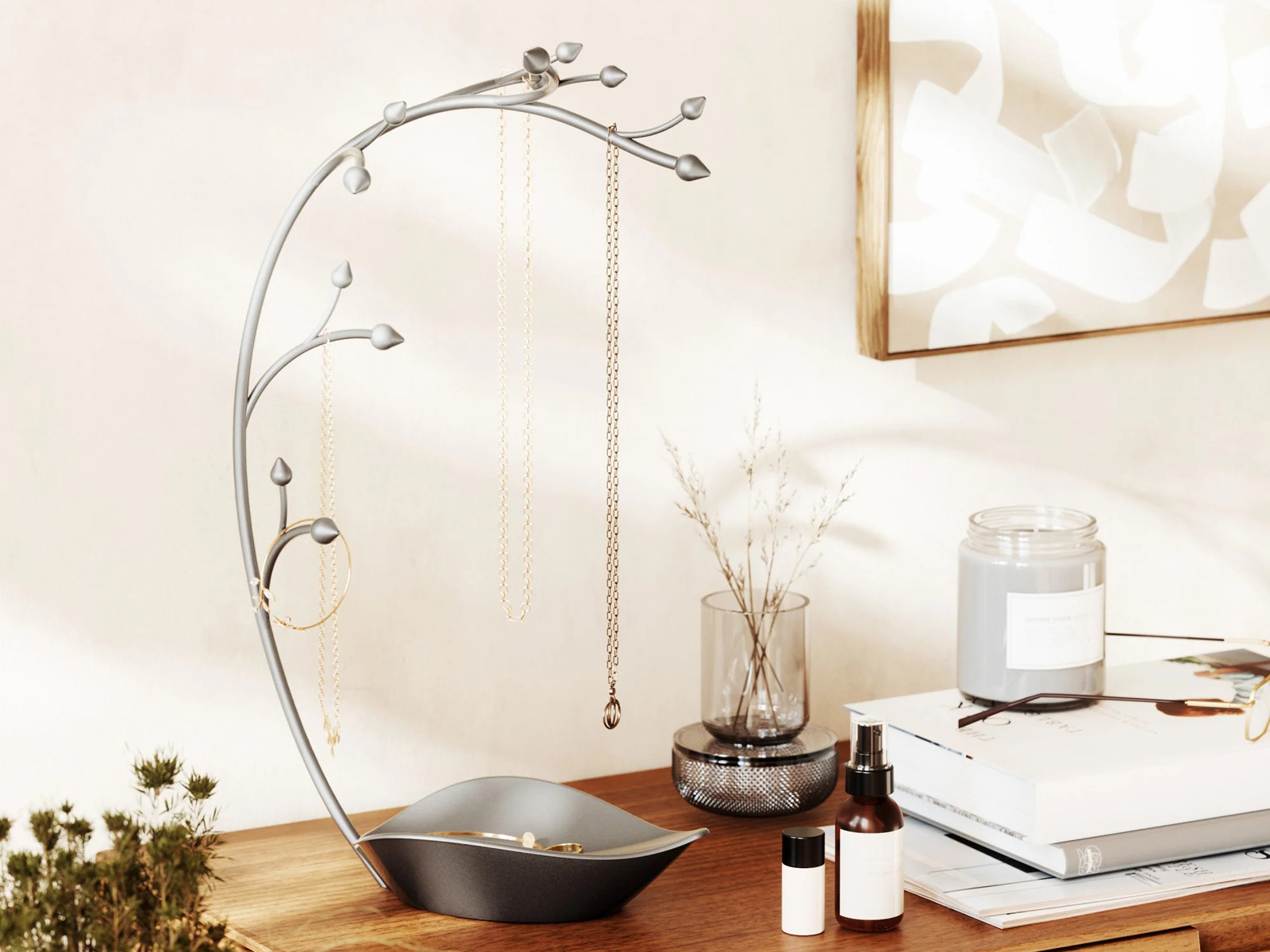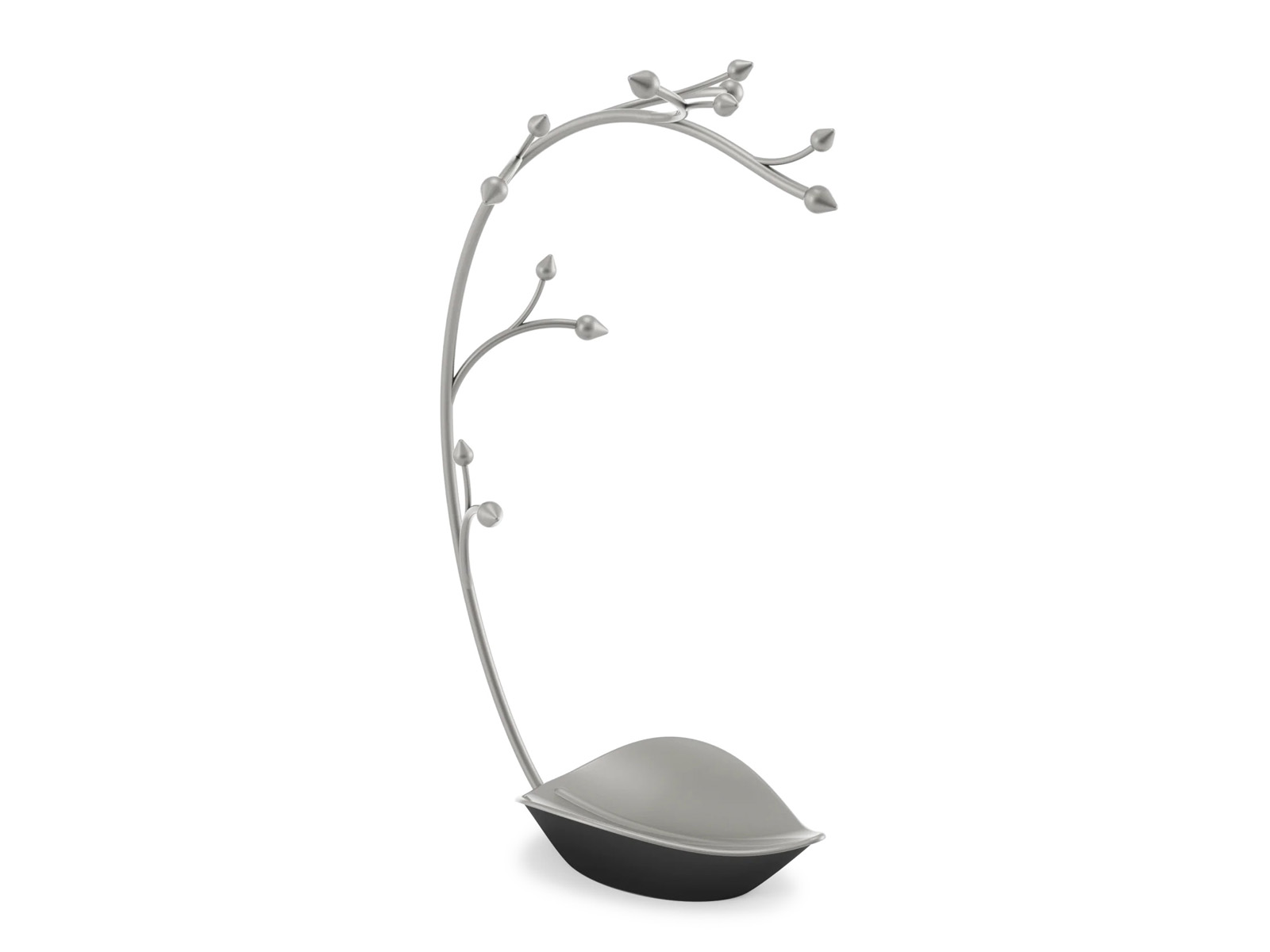 Elegancki stylizowany metalowy stojak/drzewko na biżuterie z podstawą w kształcie liścia i profilowanym ramieniem przypominającym łodygę z pączkami kwiatów jako haczykami.