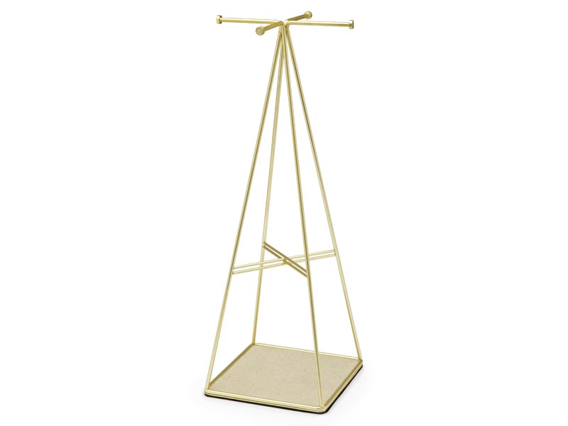 Oryginalny metalowy stojak/drzewko na biżuterie w kształcie ostrosłupa zakończonego na czubku czterema krótkimi ramionami do zawieszania łańcuszków. Prostokątna postawa wyłożona jest naturalnym lnem i spełnia równocześnie funkcję podstawki do przechowywania biżuterii np. bransoletek.