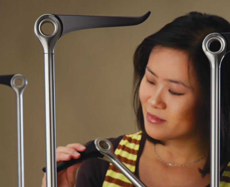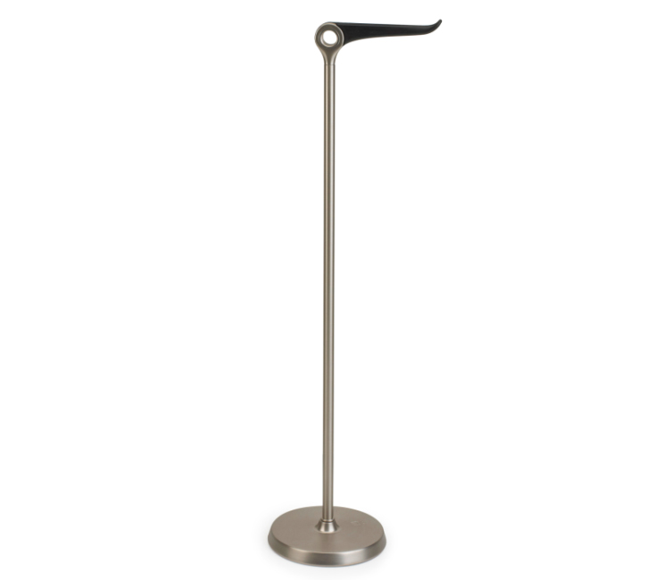 Stojak wykonany z niklowanej szczotkowanej stali niewymagającej polerowania, uchwyt z czarnego tworzywa sztucznego.